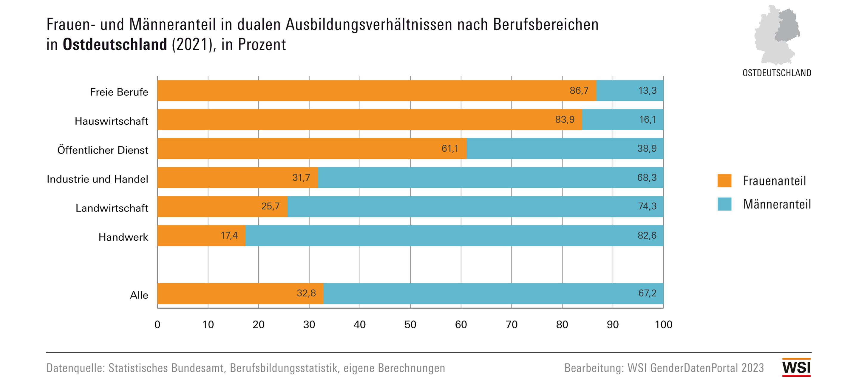 - In Westdeutschland entscheiden sich Frauen häufiger für eine Ausbildung in einem der Freien Berufe als in Ostdeutschland (Westdeutschland: 25 Prozent, Ostdeutschland: 18 Prozent).