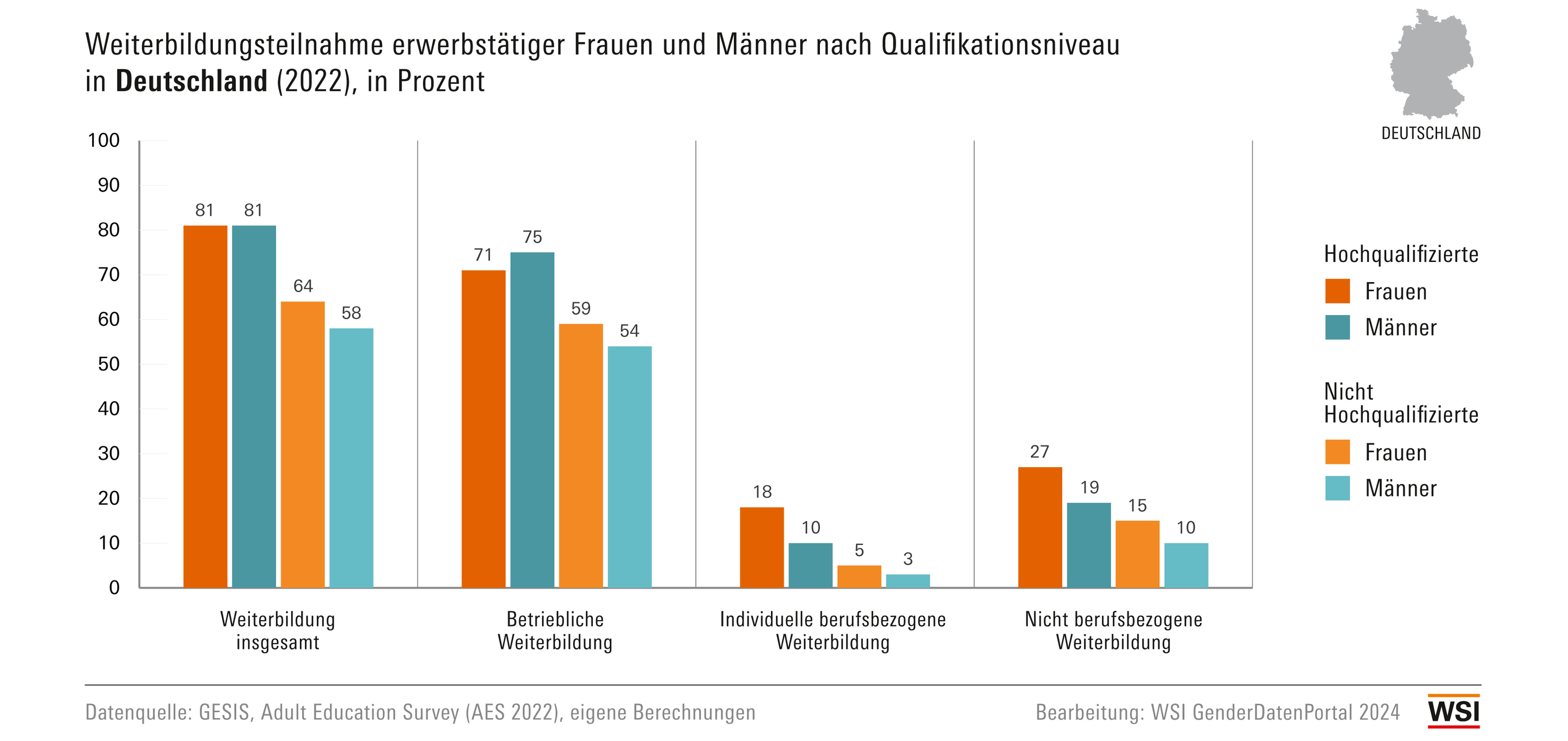 Hochqualifizierte Frauen nehmen im Jahr 2022 in Deutschland seltener an betrieblichen Weiterbildungen teil als hochqualifizierte Männer, aber häufiger an individuellen berufsbezogenen bzw. nicht-berufsbezogenen Weiterbildungen. Erwerbstätige Frauen ohne akademischen Abschluss nehmen hingegen an allen Weiterbildungsarten häufiger teil als vergleichbare Männer.