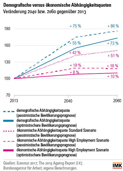 Eine Analyse auf Grundlage offizieller Daten (Labour Force Survey und Bundesagentur für Arbeit), die mit Blick auf eine realistisches Bild der Erwerbsintegration hin angepasst wurden, zeigt: Schon unter der Annahme einer weitgehend stabilen Erwerbsintegration (also nur geringer Ausschöpfung von bestehenden Potenzialen am Arbeitsmarkt) wird die Relation von älteren Menschen (65+) zu Personen im Erwerbsalter in Deutschland bis 2060 zwar um 86% steigen, das Verhältnis von Leistungsempfänger/innen zu Beitragszahler/innen dagegen nur um 51% (siehe Abbildung, Quelle: IMK-Report 137). Werden zudem steigende Erwerbsquoten angenommen, wie sie etwa heute schon in Schweden realisiert werden, reduziert sich die Steigerung auf 18%. Und werden zudem noch neuere demografische Vorausberechnungen zugrunde gelegt, die für Deutschland deutlich besser ausfallen, als noch vor kurzem angenommen, reduziert sich der Anstieg auf 10%. Das heißt, dass der Anstieg der ökonomischen Belastungsrelation durch kluge Politik auf ein Drittel, bei einer besseren demographischen Entwicklung sogar auf ein Fünftel reduziert werden kann!