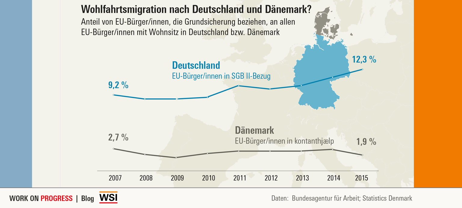 Doch auch Deutschland hat arbeitssuchende und andere nicht-erwerbstätige Unionsbürger/innen von Grundsicherungsleistungen ausgeschlossen bis sie Arbeitnehmerstatus oder Daueraufenthaltsrecht nachweisen können. Anders als in Dänemark ist der Sozialleistungsbezug durch EU-Bürger/innen aber dennoch deutlich angestiegen. Haben wir es hier also mit Wohlfahrtsmigration zu tun?