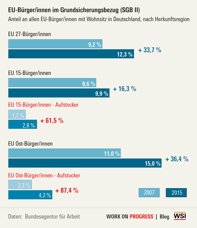 Das lässt sich bezweifeln. Zwar ist dieser Zuwachs tatsächlich – entsprechend des Wohlfahrtsmigrationsszenarios – zum ganz überwiegenden Teil auf den Zuzug von Osteuropäern zurückzuführen, aber ein genauerer Blick auf die indem folgenden Schaubild abgebildeten Bezugsdaten legt eine andere Deutung nahe. Hier zeigt sich nämlich zum einen, dass der Bezug von Grundsicherungsleistungen auch unter den EU-15-Bürger/innen angestiegen ist, also unter jenen, die nicht aus Osteuropa kommen. Dies ist insbesondere auch deshalb bemerkenswert, weil deren Anzahl in Deutschland zwischen 2007 und 2015 gesunken ist. Und zum anderen fällt auf, dass der gestiegene Bezug von Grundsicherungsleistungen vor allem durch die stark gewachsene Anzahl von Unionsbürger/innen getrieben ist, die SGB II-Leistungen als Ergänzungsleistung zu einer geringfügigen Beschäftigung erhalten („Aufstocker“). Hier sind massive Steigerungsraten sowohl bei den osteuropäischen als auch bei den EU-15-Bürger/innen zu verzeichnen.