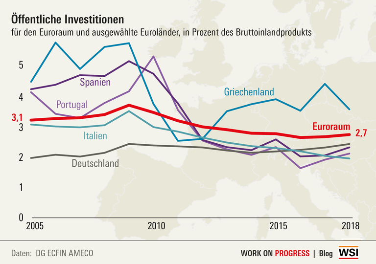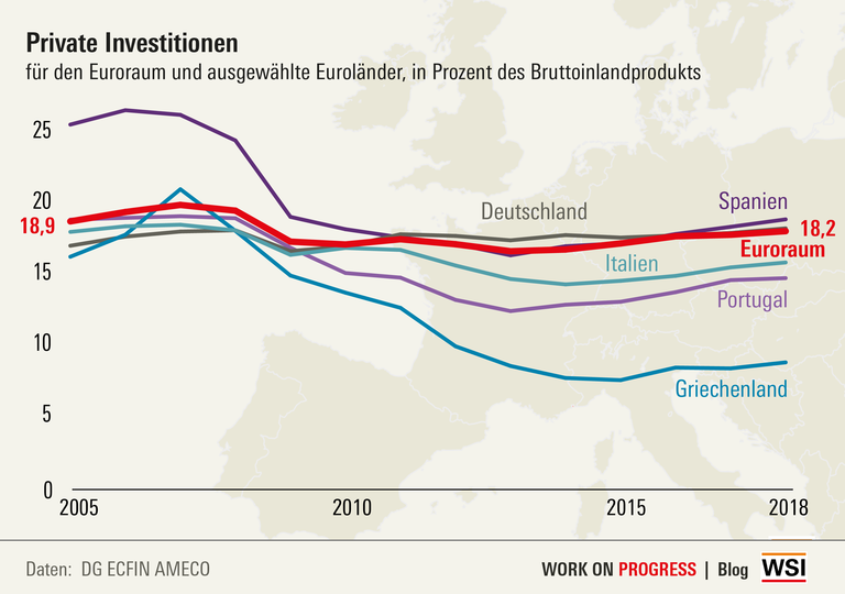 Trotz des wirtschaftlichen Aufschwungs im Euroraum haben sich die privaten und die öffentlichen Investitionen nur sehr schwach entwickelt – vor allem in den Eurokrisenländern (Abbildung 1 und 2). Das führt zu mehreren Problemen: Weil Investitionen besonders beschäftigungsintensiv sind, muss investiert werden, um die weiterhin hohe Arbeitslosigkeit von 7,9 % abzubauen. Zweitens enthalten Investitionen Innovationen, die die Produktivität und die Wettbewerbsfähigkeit einer Wirtschaft erhöhen. Entwickeln sich wie jetzt in Europa die Investitionen lange zu schwach, verliert der Kontinent nicht nur wirtschaftlich Zukunftschancen. Die hohe Arbeitslosigkeit droht die Zustimmung zum europäischen Projekt zu untergraben.