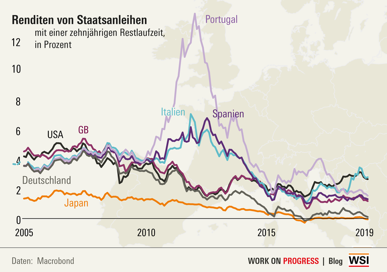 Dabei war die Zurückhaltung der EZB ein internationales Unikum: In Großbritannien, den USA und Japan haben die jeweiligen Zentralbanken – über das sognannte „Quantitative Easing“ – Staatsanleihen auf den Finanzmärkten gekauft. Dadurch wurden die Kreditgeber beruhigt, denn sie konnten im Notfall ihre Staatspapiere immer an die Zentralbank abgeben und dafür Geld erhalten. Obwohl all diese Länder auch schwere Finanzkrisen hatten und die Arbeitslosigkeit dort gestiegen ist, sind die staatlichen Zinsen gering geblieben, so dass zumindest durch diesen Kanal die Investitionen nicht gebremst wurden (Abbildung 3). Die so gewonnene Bereitschaft der Finanzmärkte, den Staaten weiter Kredite zu geben, hat den Regierungen wiederum erlaubt, in der Krise Schulden aufzunehmen und die Konjunktur zu stützen. In den USA ist nicht zuletzt aus diesem Grund die Arbeitslosigkeit viel früher gefallen als im Euroraum.