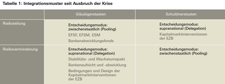 Das Ergebnis dieser Konstellation war ein auf das notwendige Minimum beschränktes Maß an Risikoteilung, das durch umfangreiche Maßnahmen der Risikoverminderung zu Lasten der Schuldnerländer abgesichert ist. Dieses Muster entspricht weitgehend den Interessen der Überschussländer. Tabelle 1 illustriert dieses Muster, indem sie die Schlüsselinstitutionen der reformierten Euro-Steuerungsarchitektur sowie die jeweils implementierten Entscheidungsmodi (zwischenstaatlich „gepooled“ oder an supranationale Institutionen „delegiert“) den Präferenzen von Gläubiger- und Schuldnerstaaten zuweist. Es wird deutlich, wie sehr die neue europäische Economic Governance mit den Präferenzen der Gläubigerstaaten übereinstimmt.
