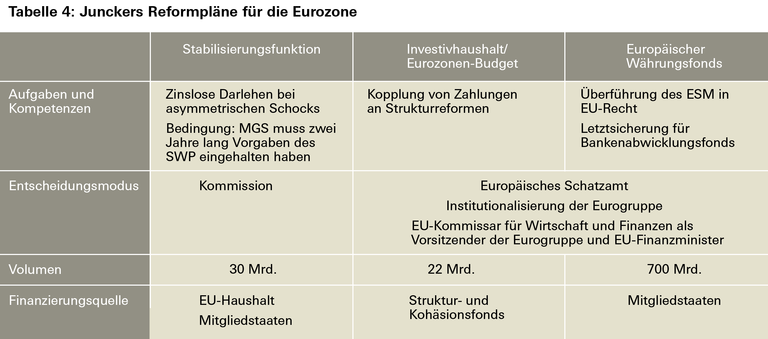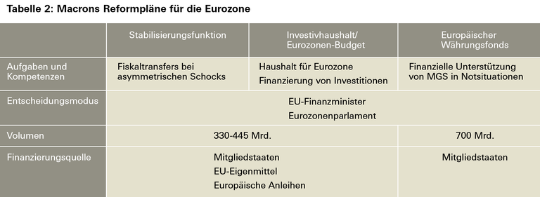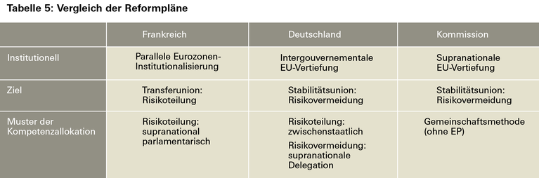 Tabelle 5 vergleicht diese Reformpläne. Macrons Vorstellungen lassen sich als eine zu den EU-Strukturen parallele Eurozonen-Institutionalisierung mit dem Charakter einer „Transferunion“ zusammenfassen. Dahingegen schwebt Merkel eine intergouvernementale EU-Vertiefung mit ausgeprägter technokratischer Komponente vor. Die Vorschläge der Kommission würden eine die Kommission stärkende supranationale EU-Vertiefung bedeuten. Insgesamt folgen die Vorstellungen von Bundesregierung und Kommission dem Leitbild einer „Stabilitätsunion“.