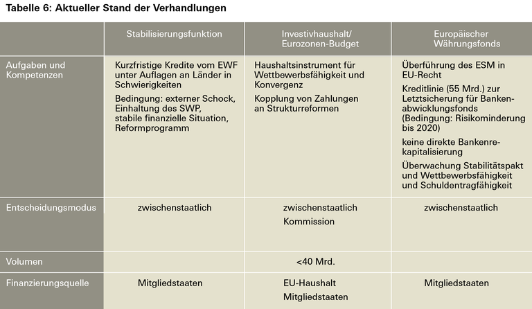 Der aktuelle Verhandlungsstand (Tabelle 6) stimmt weitgehend mit der deutschen Position überein. Die generelle Stoßrichtung entspricht dem zuvor dargestellten Integrationsmuster. Jede weitere Lastenteilung ist an weitere Konditionalitäten gebunden und hat zusätzliche Maßnahmen der Risikoverminderung zur Vorbedingung. Überdies sind weiterhin Transfers ausgeschlossen; Unterstützungen werden nur in Form zurückzuzahlender Kredite gewährt. Ferner verbleiben alle neuen Instrumente, die eine grenzüberschreitende Umverteilung beinhalten könnten, unter nationalstaatlicher Kontrolle, während die Überwachungsinstrumente an supranationale, technokratische Organe (Kommission und ESM bzw. EWF) delegiert werden: So soll der ESM zwar in einen EWF umgewandelt werden, die nationalen Veto-Rechte in den Entscheidungsgremien des EWF bleiben jedoch intakt. Der EWF soll zwar eine Kreditlinie in Höhe von ca. 55 Mrd. Euro zur Letztabsicherung des Bankenabwicklungsfonds bereithalten, dafür aber nicht mehr zur direkten Bankenrekapitalisierung herangezogen werden. Die Mitgliedstaaten sollen bei der Letztabsicherungsfunktion ihr individuelles Blockaderecht behalten. Überhaupt soll die Letztabsicherungsfunktion nur dann verwirklicht werden, wenn zuvor die Risiken in den nationalen Bankensystemen ab- und nationale Bankensicherungsfonds aufgebaut worden sind – wenn also eigentlich keine Notwendigkeit mehr für eine zusätzliche Absicherung besteht.