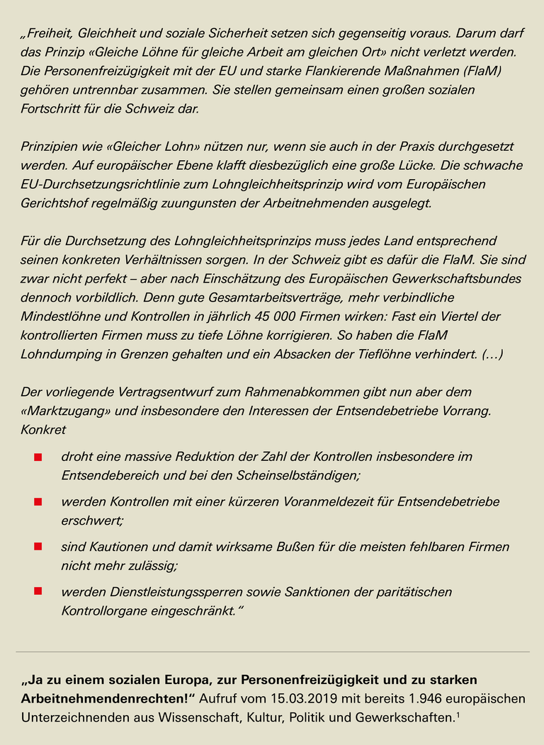 Es überrascht kaum, dass die FlaM Wirtschaftsliberalen nicht passt, die Beschäftigte gegeneinander in Konkurrenz setzen möchten. Beim Konflikt um die FlaM geht es – wie in den vergangenen EU-Referenden in Irland und Frankreich5 – nicht um einen nationalen, sondern um einen sozialen Konflikt: um die Kommodifizierung der Arbeit. Am 26. März 2019 gelang es den Liberalen und der Europäischen Volkspartei im EU-Parlament mit 330 zu 303 Stimmen, einen rot-rot-grünen Antrag abzuwehren, der den Angriff auf die FlaM aus der Resolution zur Schweiz streichen wollte. Eine allfällige Ratifizierung des derzeit vorliegenden Rahmenvertrags durch das EU-Parlament ist dennoch noch nicht sicher: Dafür müssen Liberale und EVP zuerst die EU-Wahlen im Mai gewinnen. Dies zu verhindern ist im Interesse aller Beschäftigter, auch der 1,4 Millionen EU-Bürgerinnen und -Bürger, die in der Schweiz leben.