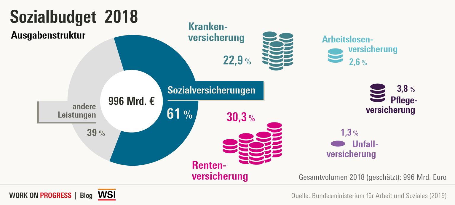 - Rund 61 Prozent aller Sozialausgaben – des Sozialbudgets – werden durch die Sozialversicherungen gestemmt. Das entspricht rund 18 Prozent des Bruttoinlandsprodukts (siehe BMAS 2018).