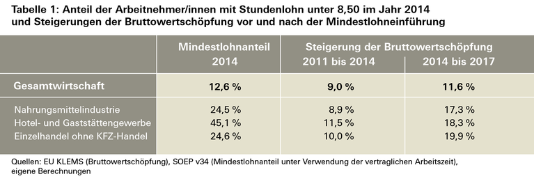 Es ist durchaus plausibel, dass sich die gestiegene Bruttowertschöpfung in typischen Niedriglohnbranchen aus beiden oben angesprochenen Effekten speist. So stiegen die durchschnittlichen Einkommen von Arbeitnehmer/innen in den Niedriglohnbranchen von Tabelle 1 im Zeitraum 2014 bis 2017 mit durchschnittlich 10 Prozent deutlich stärker als die der Arbeitnehmer/innen aller Branchen (+6,6 Prozent). Auf den Preiseffekt deutet hin, dass die Konsumentenpreisindizes in den Niedriglohnbranchen nach der Mindestlohneinführung deutlich stärker stiegen als die allgemeine Preissteigerungsrate. Nach Oliver Bruttel, Arne Baumann und Matthias Dütsch stieg „der Gesamtpreisindex zwischen den Jahren 2014 und 2016 um insgesamt 0,8 Prozent ... Im gleichen Zeitraum lag der Preisanstieg für Taxifahrten bei bundesdurchschnittlich 15,2 Prozent, für Zeitungen und Zeitschriften bei 10,1 Prozent, für Post- und Kurierdienstleistungen bei 7,0 Prozent und für Dienstleistungen in Restaurants, Cafés usw. bei 5,0 Prozent.“ Alle genannten Branchen sind durch einen hohen Anteil niedriger Löhne gekennzeichnet.