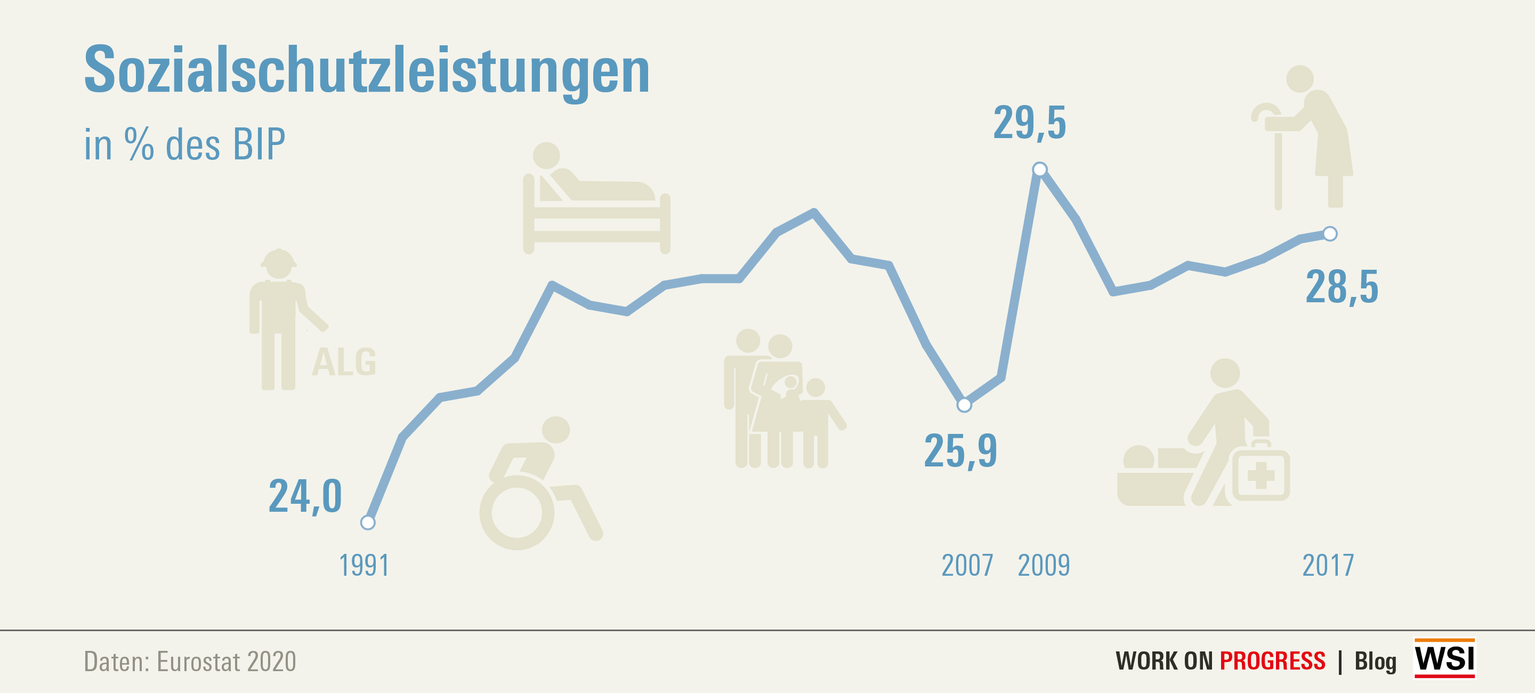 In der aktuellen Krise prognostizieren Wirtschaftsforschungsinstitute einen Rückgang des BIP zwischen 2,8 und 8,4 Prozent (real) (siehe dazu auch die Gutachten von Projektgruppe Gemeinschaftsdiagnose, IMK, SVR Wirtschaft und IAB). Das Arbeitsvolumen sinkt, die staatlich geförderte Kurzarbeit trägt aber auch in dieser Krise dazu bei, dass Beschäftigungsverhältnisse aufrechterhalten werden. Selbst wenn die kurzfristige Entwicklung ungewiss ist, erscheint es als plausibel, dass die sozialen Sicherungssysteme in dieser Krise dieselben Funktionen erfüllen wie 2009: Sie sichern Menschen materiell, geben Halt und sie ermöglichen den Zugang zu Dienstleistungen im Fall von Krankheit und Pflegebedürftigkeit. Sie sind ein flexibles Instrument der Krisenbewältigung und erfüllen eine Rolle als automatischer Stabilisator in der gesamtwirtschaftlichen Entwicklung. Renten-, Kranken- und Pflegeversicherung profitieren in einer relativ kurzen Krise davon, dass von Kurzarbeitergeld und Arbeitslosengeld I Beiträge bezahlt werden, so dass sich Einnahmenverluste in diesen Systemen zunächst in Grenzen halten und für einige Zeit verkraften lassen. Und schließlich sichert Sozialpolitik selber Arbeitsplätze, da ein erheblicher Teil der beschäftigungsintensiven öffentlichen Daseinsfürsorge durch die Sozialversicherung und Gebietskörperschaften finanziert werden: unter anderem in Pflegediensten, Krankenhäusern, Pflegeheimen und Arztpraxen. Wie schon in der letzten Krise flankieren tarifliche Regelungen das staatliche Kurzarbeitergeld.