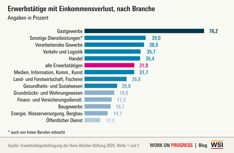 Genauere Analysen der Daten zeigen, dass diese Verluste unter den Erwerbstätigen keineswegs gleich verteilt sind. Beim Vergleich nach Branchen fällt vor allem auf, wie stark die Erwerbstätigen im Gastgewerbe betroffen sind: Mehr als drei Viertel von ihnen geben Einkommenseinbußen an. Überdurchschnittlich häufig berichten auch Erwerbstätige im verarbeitenden Gewerbe, in Verkehr und Logistik, im Handel und in sonstigen Dienstleistungen von Einbußen.