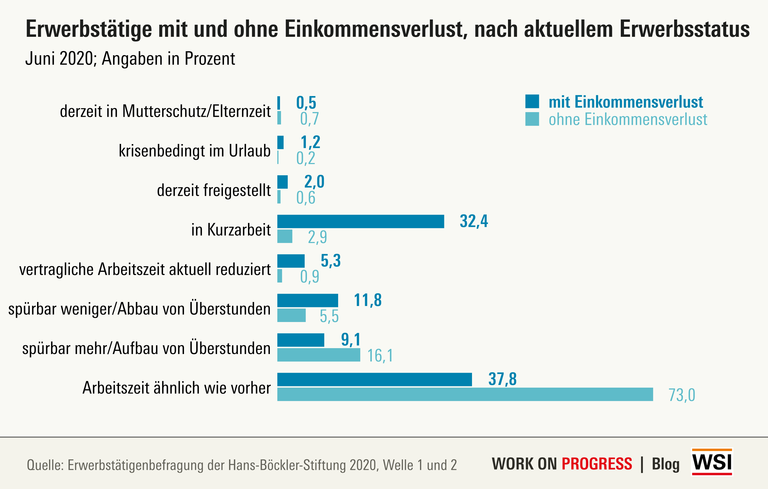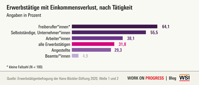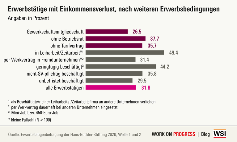 Die Beschäftigungsbedingungen und hierbei insbesondere prekäre Beschäftigung spielen insofern eine Rolle, als dass unbefristet Beschäftigte leicht unterdurchschnittlich häufig und nicht-sozialversicherungspflichtig Beschäftigte leicht überdurchschnittlich häufig Einbußen hatten. Auch geringfügig Beschäftigte und Beschäftigte, die bei einer Leiharbeits-/Zeitarbeitsfirma angestellt sind und an andere Unternehmen verliehen werden, berichten auffällig häufig von Einkommensverlusten.
