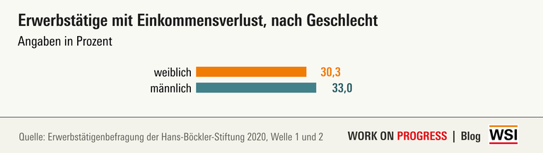 Außerdem zeigen die Ergebnisse der Befragung, dass Gewerkschaftsmitglieder seltener Einbußen zu verzeichnen hatten (26,5 Prozent). Erwerbstätige in Betrieben ohne Mitbestimmung mussten häufiger auf Teile ihres Einkommens verzichten (von den Erwerbstätigen in Betrieben ohne Betriebsrat 37,7 Prozent, in Betrieben ohne Tarifvertrag 35,7 Prozent).