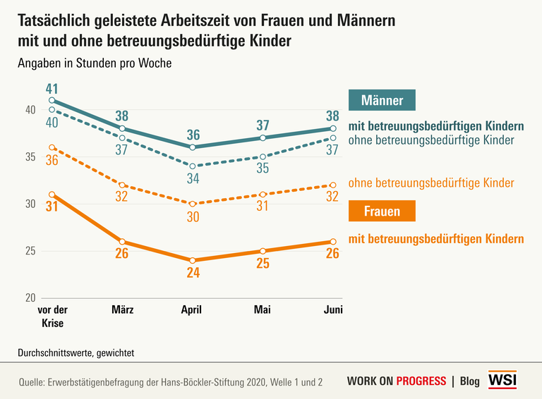 Ein Vergleich der Arbeitszeiten von Männern und Frauen, die mit betreuungsbedürftigen Kindern im Haushalt leben, ergibt, dass Frauen ihre Arbeitszeit zu Beginn der Krise durchschnittlich um vier Stunden reduziert haben, während Männer dies nur um drei Stunden taten. Auch wenn die Arbeitszeit im Verlauf der Krise wieder anstieg, blieb der Unterschied stabil. Damit scheint sich die Arbeitszeitlücke zwischen Männern und Frauen mit betreuungsbedürftigen Kindern, wenn auch auf höherem Niveau, nachhaltig zu vergrößern.