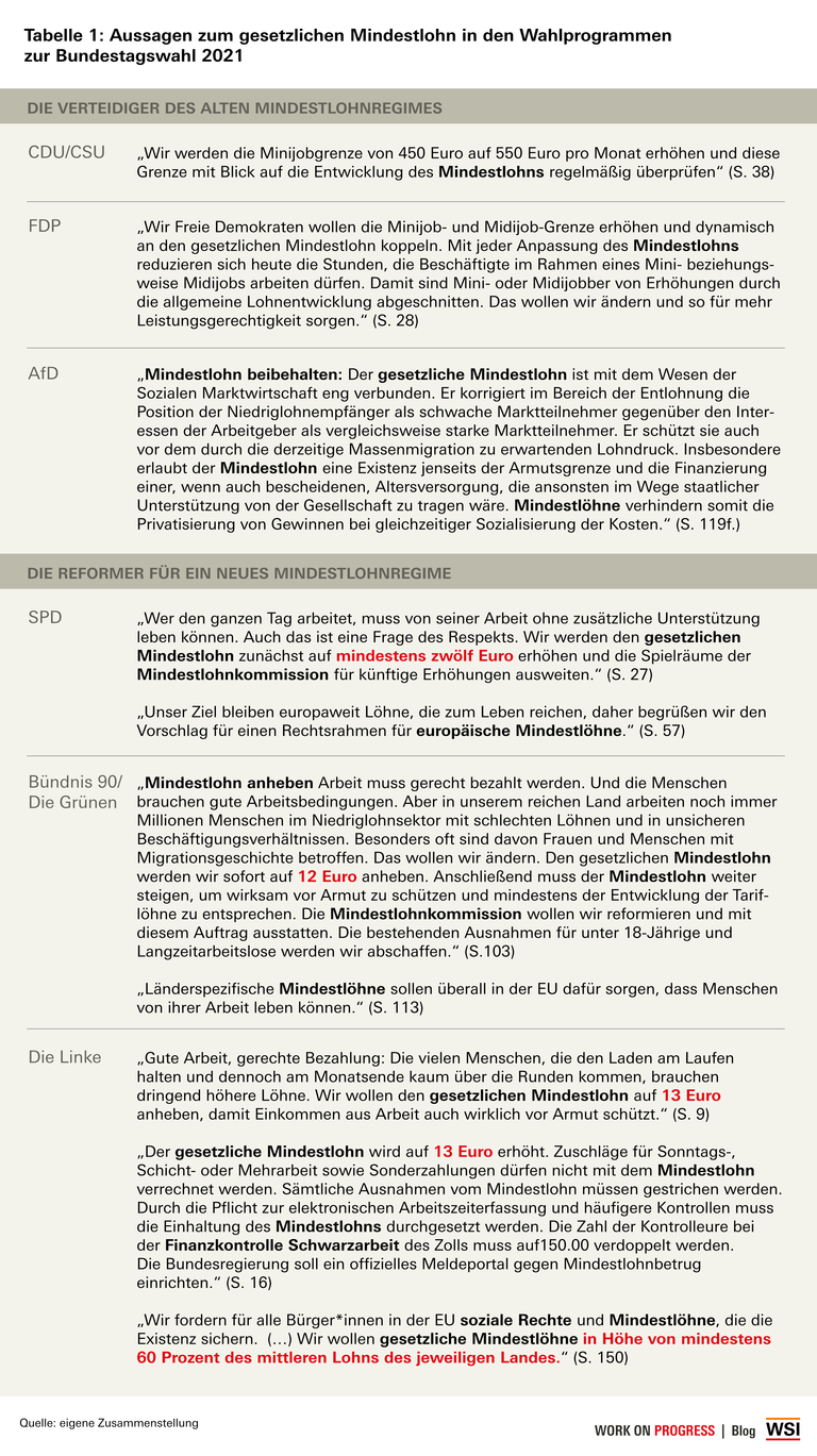 Der Blick in die Wahlprogramme zur Bundestagswahl 2021 bestätigt beim Mindestlohn einmal mehr eine Zweiteilung entlang des traditionellen Links-Rechts-Schemas (Tabelle 1): Auf der einen Seite stehen CDU/CSU, FDP und AfD, die im Hinblick auf dem Mindestlohn keinerlei Änderungsbedarf sehen und den Status quo im Wesentlichen fortschreiben wollen. Auf der anderen Seite treten SPD, Grüne und Linke für eine strukturelle Erhöhung des Mindestlohns auf 12 bzw. 13 Euro pro Stunde ein und wollen darüber hinaus den Anpassungsmechanismus reformieren.