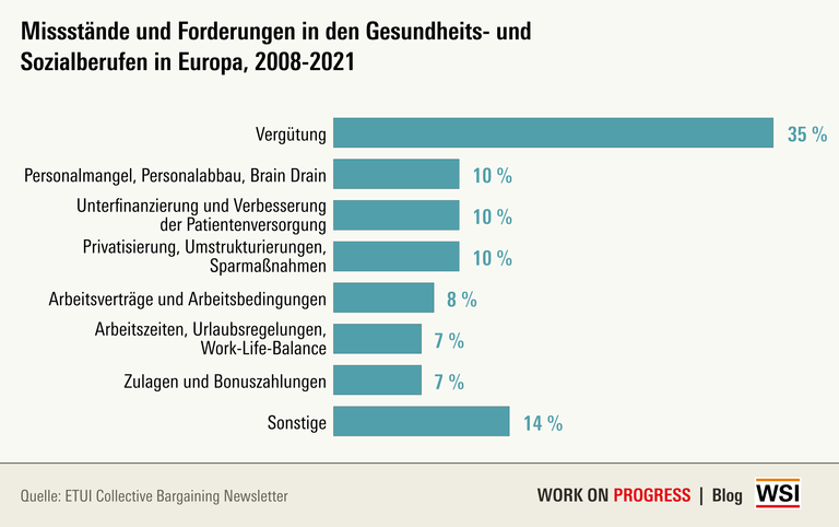 Zudem sind die Forderungen des Gesundheits- und Pflegepersonals vielfältig (siehe Diagramm). Probleme wie zu geringe finanzielle Ausstattung, Personalmangel und Stress sind auf die Vermarktlichung des Sektors oder auf die Austeritätspolitik zurückzuführen, die Regierungen nach der Finanzkrise des Kapitalismus durchgesetzt haben, ohne dafür einen Masterplan zu haben. Die Tatsache, dass zahlreiche Pflegeberufe frauendominiert sind, leistet nicht nur einen Beitrag zur „Feminisierung“ von Arbeitskampfmaßnahmen, sondern bringt auch das geschlechtsspezifische Lohngefälle als Missstand ins Spiel, wobei die Kritik der Beschäftigten nicht allein auf die Entlohnung beschränkt ist.