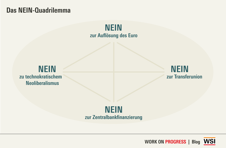 Diese Konstellation wird zu einem Quadrilemma, weil von den genannten vier Elementen – Erhalt der Währungsunion, technokratischer Neoliberalismus, Transferunion und Zentralbankfinanzierung – immer nur drei gleichzeitig verwirklicht werden können. Man kann eine Währungsunion mit einem „Nein“ zur Transferunion und zur Zentralbankfinanzierung kombinieren. Dann muss allerdings ein technokratischer Neoliberalismus in Kauf genommen werden, um alle Länder zu eurozonenkompatiblen Ökonomien umzubauen. Wenn man jedoch keinen technokratischen Neoliberalismus will und gleichzeitig eine Zentralbankfinanzierung ablehnt, muss man Transfers zulassen, damit die Leistungsbilanzdefizite ausgeglichen werden. Wenn man weder einen technokratischen Neoliberalismus noch eine Transferunion will, müssen die Schulden der Defizitländer von der EZB finanziert werden. Die einzige zu diesen Kombinationen denkbare Alternative ist die Auflösung des Euro.