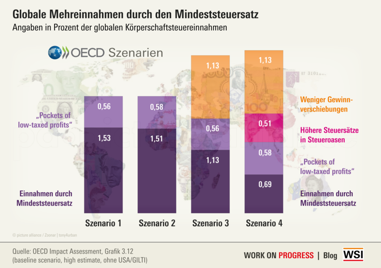 Säule 2 hingegen hätte massive Auswirkungen auf die Steuereinnahmen aller Staaten. Im Basisszenario steigen die Steuereinnahmen um bis zu 70 Mrd. US-Dollar. Im Zusammenspiel mit der Säule 1 und den Mindeststeuern in den USA würden die Gewinnsteuereinnahmen sogar um ca. vier Prozent bzw. 100 Mrd. US-Dollar weltweit steigen. Spannend sind die vier Szenarien, die die OECD dazu gerechnet hat. Szenario 1 erfasst die „reinen“ Mehreinnahmen durch den Mindeststeuersatz inklusive der sogenannten „low-taxed pockets in high-tax jurisdictions“, also z.B. die Gewinne, die in der französischen oder belgischen Patentbox mit weniger als 12,5 Prozent effektiv besteuert werden. Szenario 2 berücksichtigt zusätzlich die Umverteilung durch Säule 1 – die Veränderung ist aber gering. In Szenario 3 rechnet die OECD dann auch die Mehreinnahmen durch eine Reduktion der Steuertricks mit ein. Man geht davon aus, dass mit dem sinkenden Steuerdifferential zwischen Niedrig- und Normalsteuerländer durch den Mindeststeuersatz auch die Gewinnverlagerung zurückgeht. Das bringt zusätzliche Einnahmen. In Szenario 4 wird berücksichtigt, dass die Niedrigsteuerländer die Möglichkeit haben, ihre Steuersätze (auf 12,5 Prozent effektiv) zu erhöhen. Die OECD nimmt an, dass einige Staaten das tun werden, wodurch sich ein Teil der Mehreinnahmen zu den (ehemaligen) Niedrigsteuerländern verschiebt.