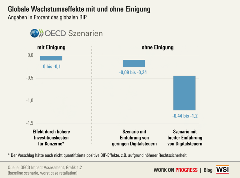 Demgegenüber sieht die OECD große ökonomische Probleme, wenn sich die Staaten nicht auf eine Reform der Konzernsteuerregeln einigen können. In diesem Fall ist davon auszugehen, dass die Einzelstaaten oder Staatenblöcke (wie beispielsweise die EU) zu unilateralen Maßnahmen greifen und ein Steuer- und Handelskrieg entsteht. Als Vorbote für diese Entwicklung kann der Konflikt Frankreich-USA gesehen werden. Als die französische Regierung eine nationale Digitalsteuer einführen wollte, die vor allem US-amerikanische Internetkonzerne getroffen hätte, hat die US-amerikanische Regierung mit Strafzöllen, z.B. auf französische Weine, geantwortet. Ein solches Szenario könnte einen globalen BIP-Einbruch von mehr als einem Prozent bringen (siehe Abbildung).