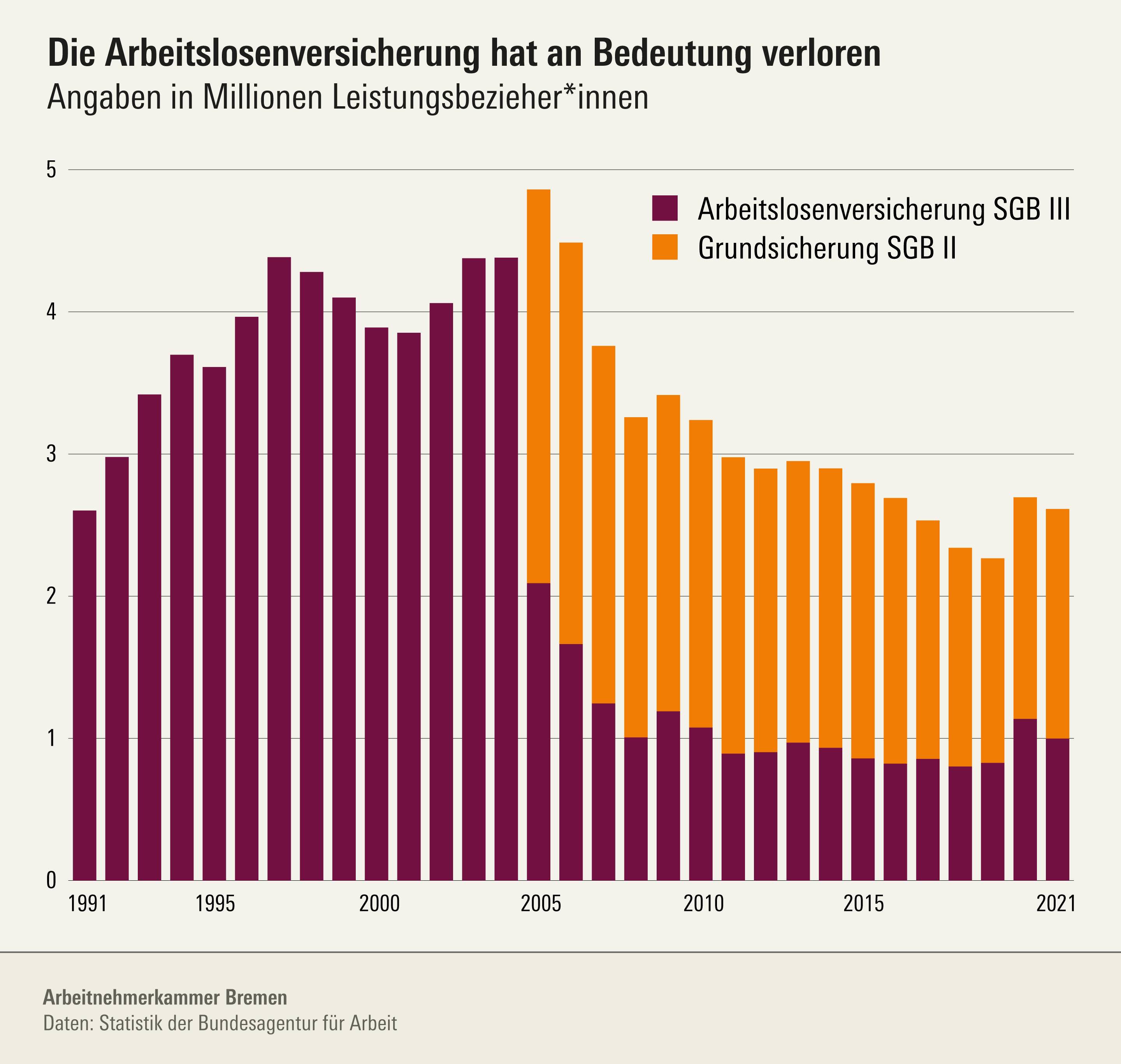 Im Koalitionsvertrag hat die Bundesregierung versprochen, die bisherige Grundsicherung für Arbeitsuchende hinter sich zu lassen und stattdessen ein Bürgergeld einzuführen. Als Rot und Grün das letzte Mal gemeinsam Regierungsverantwortung trugen, beschlossen sie die hoch umstrittene Sozialreform, die 2005 unter dem Namen „Hartz IV“ in Kraft trat und Furore machte. Sie schafften die Arbeitslosenhilfe und die bisherige Sozialhilfe ab und schufen stattdessen neben der Arbeitslosenversicherung ein Fürsorgesystem, in dem jede Arbeit als zumutbar gilt und durch den Druck eines harten Sanktionsregime anzunehmen ist. Die Arbeitslosenversicherung verlor dagegen bei der Unterstützung von Arbeitslosen an Bedeutung.