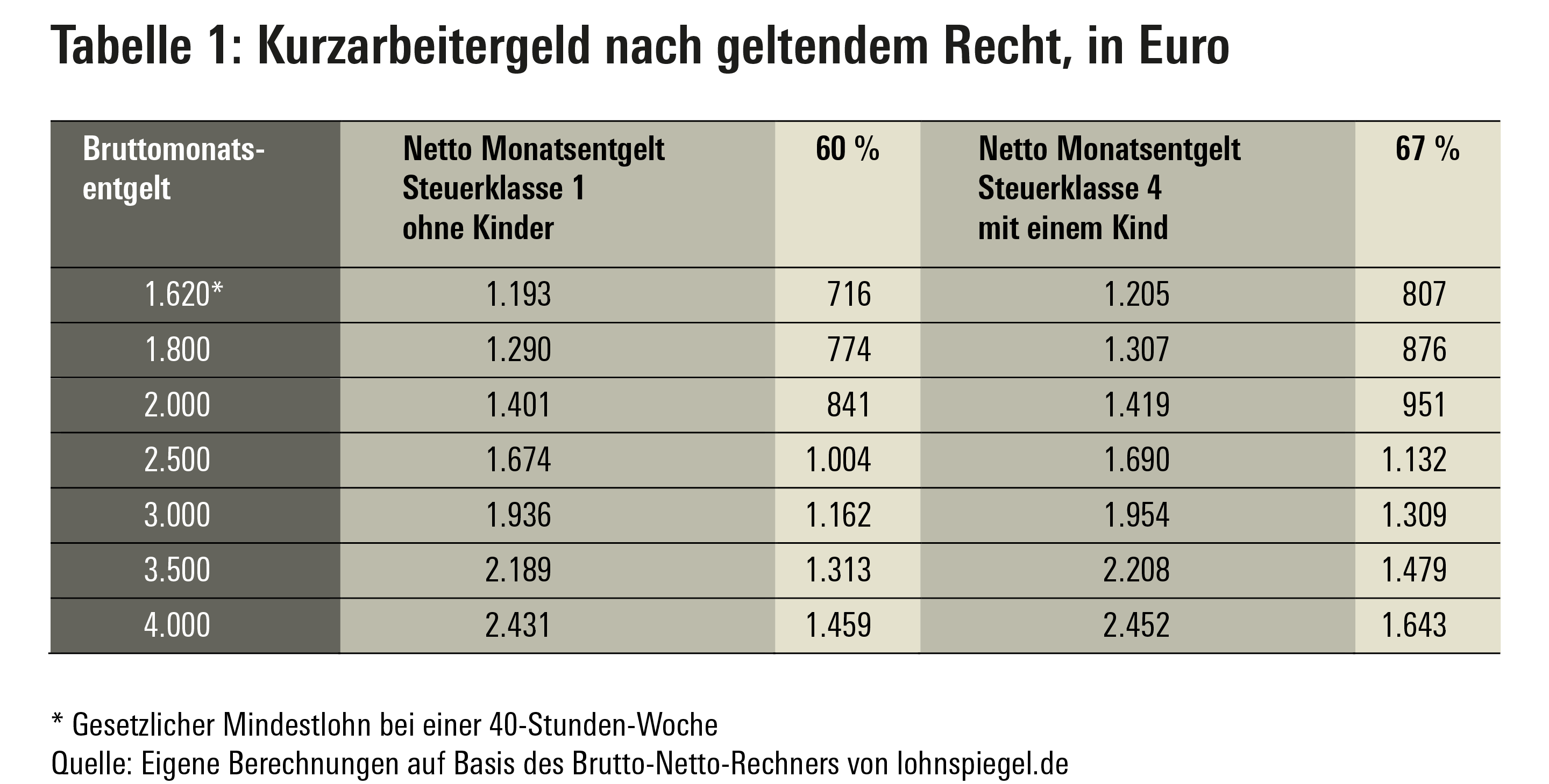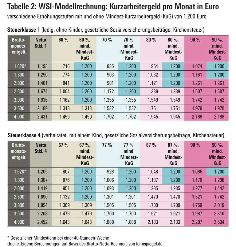 In der Corona-Krise führt der ökonomische Shutdown dazu, dass die Kurzarbeit in vielen Bereichen auf null Stunden herabgesenkt wird. Vor diesem Hintergrund führt ein um 40 Prozent (bzw. 33 Prozent mit Kindern) reduziertes Nettoentgelt bei vielen Beschäftigten zu erheblichen Einkommensbußen. Hart getroffen werden vor allem die Niedrigeinkommensbezieher. Für Alleinverdiener ohne Kinder mit der Steuerklasse 1 überschreitet das Kurzarbeitergeld erst ab einem Bruttomonatseinkommen ab 2.500 Euro einen Betrag von 1.000 Euro (Tabelle 1). Legt man als Orientierungsgröße den gesetzlichen Mindestlohn zugrunde, ergibt sich folgende Beispielrechnung: Der aktuelle gesetzliche Mindestlohn von 9,35 Euro beläuft sich bei einer Wochenarbeitszeit von 40 Stunden auf einen monatlichen Bruttoverdienst von rund 1.620 Euro. Davon bleiben bei Steuerklasse 1 (ohne Kinder) netto rund 1.200 Euro. Selbst bei einem Bruttomonatsverdienst von 3.000 Euro wird dieser Betrag noch unterschritten. Das Bild bessert sich nur wenig, wenn man das Kurzarbeitergeld von 67 Prozent für Beschäftigte mit Kindern in der Steuerklasse 4 zugrunde legt. Bei einem Bruttomonatsverdienst von 2.500 Euro bleibt das Kurzarbeitergeld in Höhe von rund 1.132 Euro deutlich unter dem genannten Nettolohn von 1.200 Euro, der bei dem gesetzlichen Mindestlohn erreicht würde.