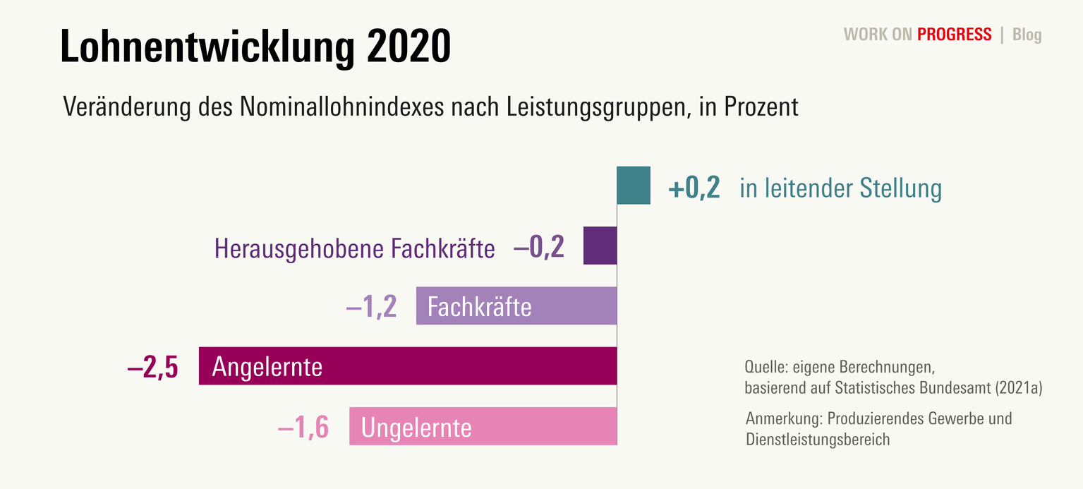 Den meisten Zeitungen war die Meldung nur eine Randnotiz wert: Im Corona-Jahr 2020 sind die Nominallöhne in Deutschland um 0,7 % gesunken, der erste Rückgang seit Beginn der Vierteljährlichen Verdiensterhebung im Jahr 2007. Angesichts der wirtschaftlichen Verwerfungen des vergangenen Jahres mag der Rückgang moderat erscheinen – selbst nach Abzug der Inflation schrumpften die Reallöhne „nur“ um 1,1 %. Die eigentliche Sprengkraft der Lohnentwicklung liegt in ihrer sozialen Unwucht. Diese zeigt sich, wenn man die Daten des Statistischen Bundesamtes (2021a) nach Leistungsgruppen aufschlüsselt: Am oberen Rand der Lohnverteilung – bei Arbeitnehmer:innen in leitender Stellung (+0,2 %) und herausgehobenen Fachkräften (‑0,2 %) – waren zumindest die Nominallöhne weitgehend stabil. Deutliche Lohneinbußen gab es bei Fachkräften (‑1,2 %), den Angelernten (‑2,5 %) sowie den Ungelernten (‑1,6 %).