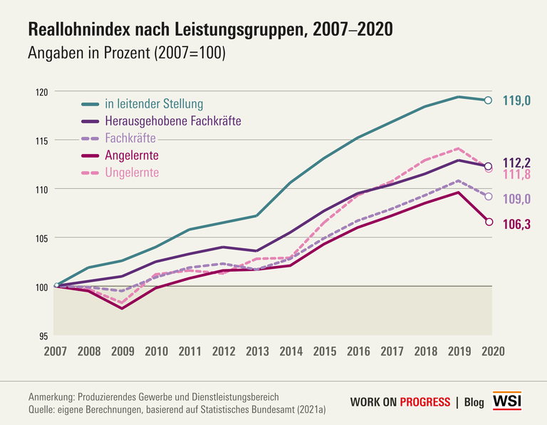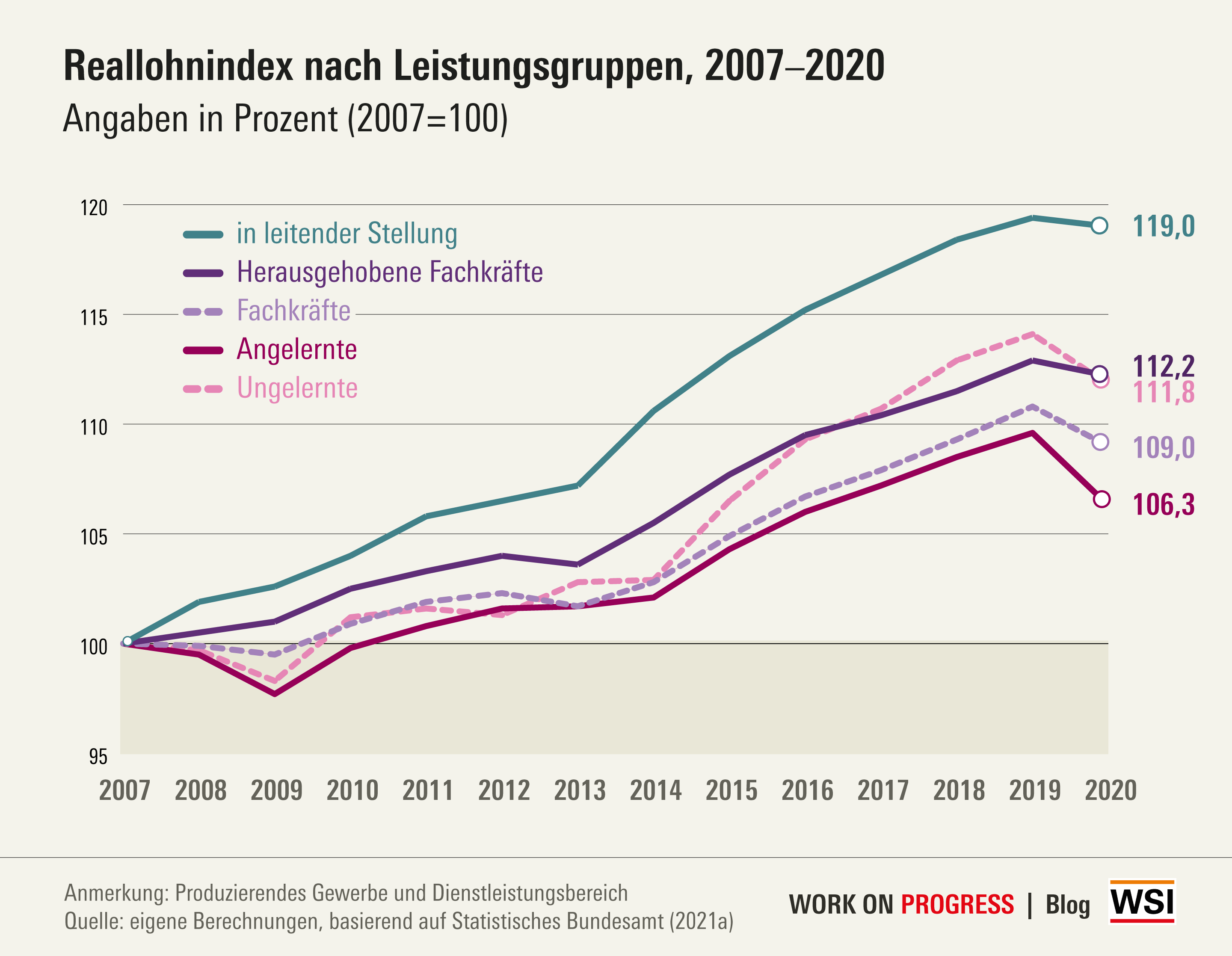 Die Pandemie hat auch langfristige Fehlentwicklungen aufgezeigt. So werden viele gesellschaftlich wichtige Tätigkeiten in systemrelevanten Sektoren unterbezahlt (Lübker und Zucco 2020). Die Daten des Statistisches Bundesamtes (2021b) zeigen, wie niedrig die Bruttostundenverdienste in einigen Branchen sind: Im Einzelhandel mit Nahrungs- und Genussmitteln lagen diese 2020 in der Leistungsgruppe 4 (Angelernte) für Vollzeitbeschäftigte bei 12,35 Euro, in Call Centern bei 12,07 Euro und Gastgewerbe bei 11,89 Euro (jeweils ohne Sonderzahlungen). Gemessen am Reallohnindex sind die Verdienste der Angelernten seit 2007 insgesamt nur um 6,3 % gestiegen – verglichen mit 9,0 % bei den Fachkräften, 12,2 % bei den herausgehobenen Fachkräften und 19,0 % bei Arbeitnehmer:innen in leitender Stellung (siehe Abbildung). Auch die langfristige Lohnentwicklung hat also eine deutliche soziale Unwucht. Einzige Ausnahme sind die Ungelernten (Gruppe 5, +11,8 %), die bei Einführung des Mindestlohns im Jahr 2015 einen einmaligen, deutlichen Lohnzuwachs erhielten.