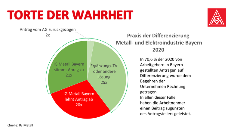 Seit der Tarifrunde 2018, in der die IG Metall kräftige Entgeltsteigerungen und eine Wahloption „Mehr Zeit oder Geld“ durchsetzen konnte, stellen die Metallarbeitgeber den aktuellen tarifpolitischen Status quo in Frage. 2019 drohte der damalige Gesamtmetall-Präsident Rainer Dulger gar mit dem Ende des Flächentarifvertrags. „Wenn alle Unternehmen die Tarifbindung verlassen, kann die Gewerkschaft zusehen, wie sie sich im Häuserkampf durchschlägt.“ In der aktuellen Tarifrunde konzentrieren sie sich auf eine weitere Lockerung des Flächentarifs: „Wir brauchen auch sehr viel mehr individuelle Möglichkeiten, um vom Flächentarifvertrag abweichen zu können.“ Die IG Metall konterte: So präsentierte zum Beispiel der bayerische IG Metall-Bezirksleiter Johann Horn in den Tarifverhandlungen eine „Torte der Wahrheit“. Danach wurden in 70 Prozent der von den Arbeitgebern 2020 in Bayern gestellten Anträgen auf Differenzierung dem Begehren der Unternehmen Rechnung getragen. Der baden-württembergische Bezirksleiter Roman Zitzelsberger wies in einer Pressekonferenz im Dezember darauf hin, dass seit April 2020 etwa 193 Vereinbarungen nach dem Pforzheimer Abkommen verhandelt und 94 abgeschlossen seien. Doch das nützte bislang wenig.