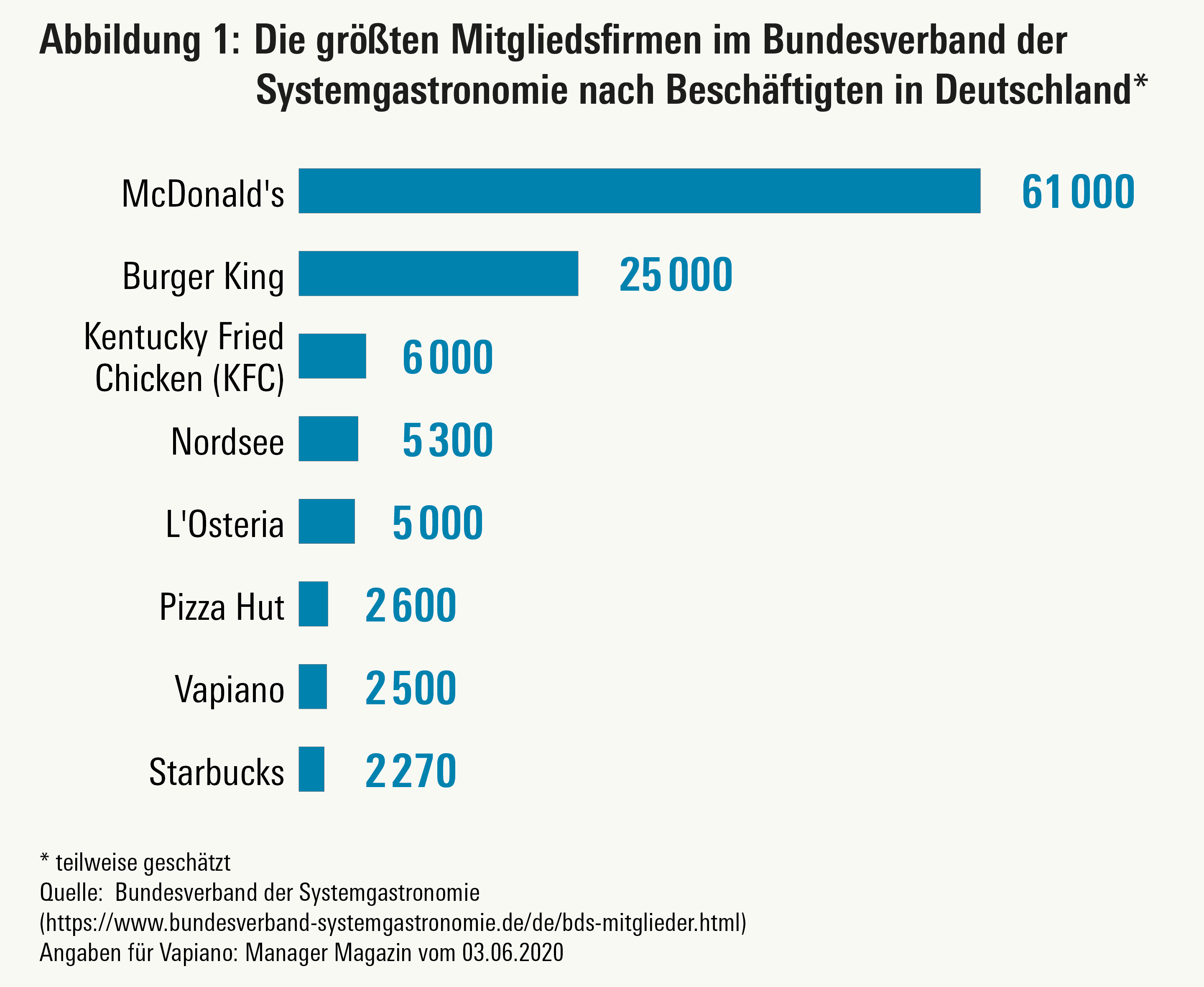 Der Bundesverband der Systemgastronomie (BdS) als führender Arbeitgeber- und Wirtschaftsverband der Branche repräsentiert nach eigenen Angaben mehr als 830 Mitgliedsunternehmen, die in Deutschland mehr als 3.000 Restaurants betreiben, in denen etwa 120.000 Beschäftigte arbeiten. Das mit Abstand größte Mitgliedsunternehmen des BdS ist dabei die Fast-Food-Kette McDonald’s, die in Deutschland mehr als 60.000 Arbeitnehmer*innen beschäftigt. An zweiter Stelle folgt die Fast-Food-Kette Burger King mit etwa 25.000 Beschäftigten. Beide Unternehmen zusammen repräsentieren bereits mehr als zwei Drittel aller Beschäftigten in den BdS-Mitgliedsunternehmen. Hinzu kommen noch einige größere Restaurantketten wie Kentucky Fried Chicken, Nordsee, L’Osteria, Pizza Hut, Vapiano und Starbucks mit jeweils mehreren Tausend Beschäftigten (Abbildung 1). Die Mehrzahl der BdS-Mitgliedsfirmen sind dagegen eher mittlere und kleinere Restaurantketten mit jeweils einigen hundert Mitarbeiter*innen.
