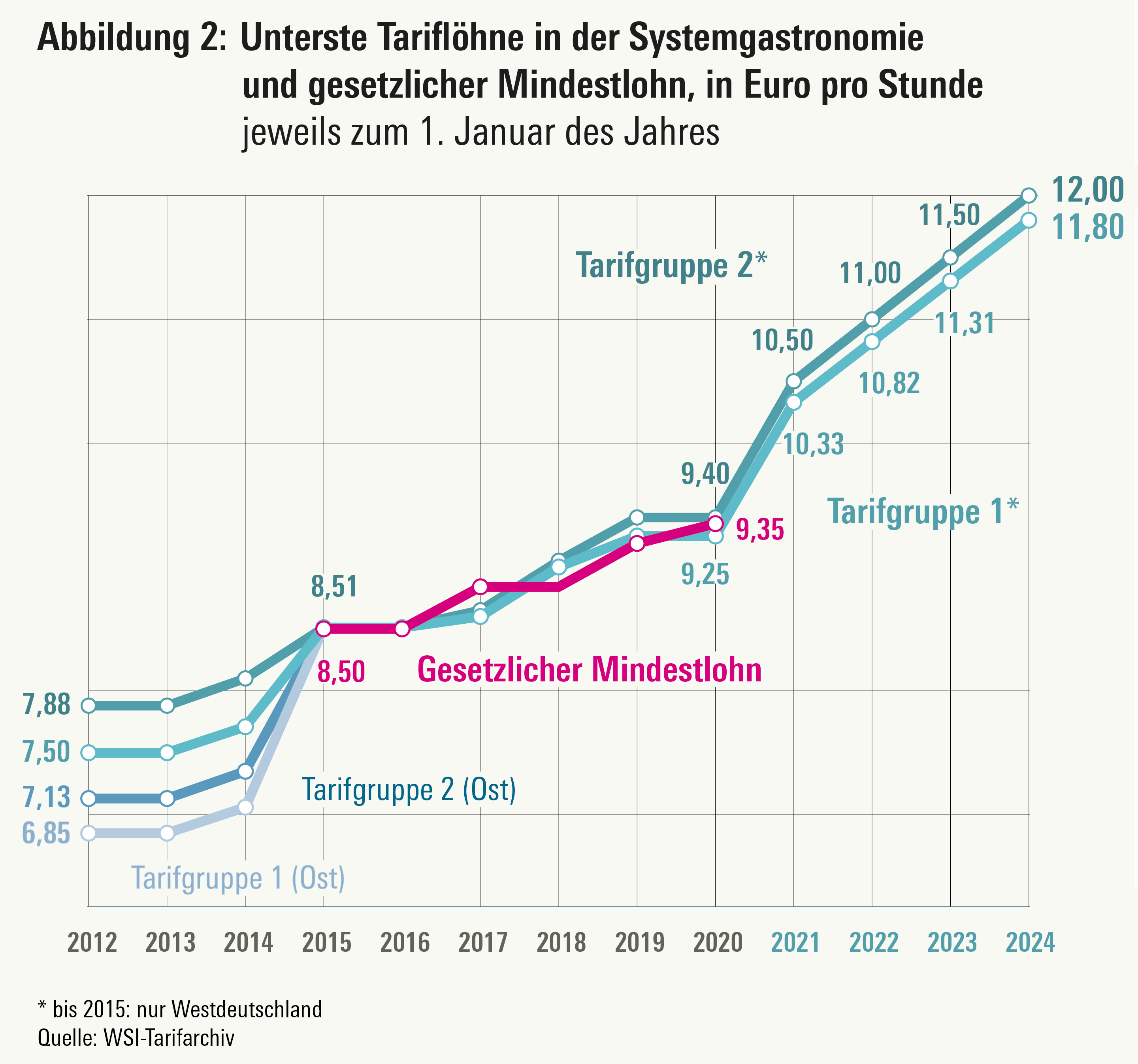 Seit 2015 liegen die untersten Tariflöhne in der Systemgastronomie nur knapp über dem gesetzlichen Mindestlohn. In den Jahren 2017 und 2020 hat die Mindestlohnanpassung sogar dazu geführt, dass die unterste Tarifgruppe unterhalb des gesetzlichen Mindestlohnniveaus lag und demnach unwirksam wurde. Die Tarifpolitik in der Branche konzentrierte sich entsprechend darauf, die durch die Entwicklung des Mindestlohns vorgegebenen Anpassungsnotwendigkeiten tarifpolitisch nachzuvollziehen.