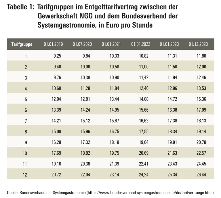 Im März 2020 wurde zwischen der Gewerkschaft Nahrung-Genuss-Gaststätten (NGG) und dem Bundesverband der Systemgastronomie (BdS) ein neuer Tarifvertrag abgeschlossen, der ausgehend von einem Entgeltniveau nahe am Mindestlohn eine schrittweise Erhöhung der unteren Entgeltgruppen auf 12 Euro pro Stunde vorsieht. Der Tarifvertrag ist das Ergebnis einer neuen Tarifpolitik im Niedriglohnsektor, die sich nicht länger mit der Tarifierung von nicht existenzsichernden Armutslöhnen abfinden will, sondern auf eine grundlegende tarifpolitische Aufwertung der Branchen zielt. Dabei macht sie sich einerseits die Diskussion um einen angemessenen gesetzlichen Mindestlohn zu Nutze und schafft andererseits ein Beispiel, das auch für die zukünftige Anpassung des Mindestlohns als Vorbild dienen könnte.