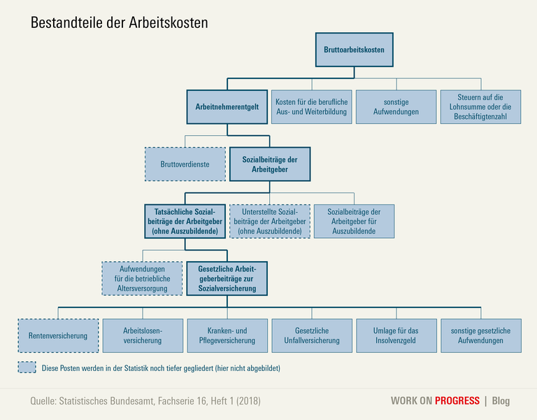 Sozialversicherungsbeiträge werden in der Regel auf das sozialversicherungspflichtige Bruttoeinkommen der Beschäftigten erhoben. Ein Anstieg der paritätisch getragenen Sozialversicherungsbeiträge senkt unter sonst gleichen Bedingungen das Nettoeinkommen der Beschäftigten und steigert die Arbeitskosten der Arbeitgeber. Die Kommission der BDA hält unter Bezugnahme auf eine Reihe von Studien einen Anstieg der Beitragssätze zur Sozialversicherung von derzeit knapp unter 40 Prozent auf 50 Prozent bis 2040 für realistisch. Dieser Anstieg um zehn Prozentpunkte wäre von Arbeitgebern und Beschäftigten zusammen zu tragen. Die Kosten betragen dann für jede Seite fünf Prozentpunkte. In welchem Umfang steigen in diesem Szenario die Arbeitskosten? Die Sozialversicherungsbeiträge sind nur ein Teil der Arbeitskosten. Das Statistische Bundesamt weist die Bestandteile der Arbeitskosten auf Grundlage der Arbeitskostenerhebung aus (publiziert in Fachserie 16; zuletzt wurden die Daten 2016 erhoben und 2018 veröffentlicht). In die Bruttoarbeitskosten fließen neben den Arbeitnehmerentgelten die Kosten für die betriebliche Aus- und Weiterbildung, sonstige Aufwendungen und Steuern auf Lohnsumme oder Beschäftigtenzahl ein. Die Arbeitnehmerentgelte wiederum gliedern sich in Bruttoverdienste und Sozialbeiträge der Arbeitgeber auf. Die Sozialbeiträge der Arbeitgeber beinhalten unter anderem die gesetzlichen Arbeitgeberbeiträge zur Sozialversicherung. In die Bruttoarbeitskosten gehen damit eine ganze Reihe von Posten ein, die Arbeitgeber einkalkulieren müssen, die Bereitstellung von Firmenwagen ebenso wie die Entgeltfortzahlung im Krankheitsfall oder die Vergütung für Feiertage.