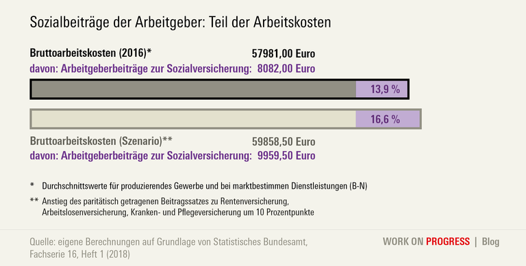 Wird nun angenommen, dass der paritätisch getragene Beitragssatz zur Renten-, Arbeitslosen, Kranken- und Pflegeversicherung um zehn Prozentpunkte steigt (er lag auch 2016 knapp unter 40 Prozent), heißt das, dass in den Werten von 2016 der Beitrag zu diesen Zweigen der Sozialversicherung 9.387,50 Euro (statt 7.510 Euro) betrüge. Die gesamten Beiträge zur Sozialversicherung stiegen damit auf 9.959,50 Euro, die gesamten Bruttoarbeitskosten auf 59.858,50 Euro. Das ist ein Anstieg um 3,2 Prozent der gesamten Arbeitskosten. Der Anteil der gesamten gesetzlichen Arbeitgeberbeiträge zur Sozialversicherung würde von 13,9 auf 16,6 Prozent steigen.