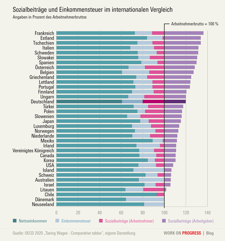 Im Kommissionsbericht wird zudem auf die gesamten Abgaben auf Löhne (Sozialabgaben und Einkommensteuer) hingewiesen, wobei nach OECD-Daten auf die Löhne von alleinstehenden, kinderlosen Durchschnittsverdienern nur in Belgien höhere Beiträge und Steuern entfallen würden als in Deutschland. Das ist korrekt wiedergegeben, aber auch nur die halbe Wahrheit. Im Kommissions-Bericht werden die Einkommensteuern und gesamten Sozialabgaben, die auf den Lohn entfallen, als Anteil der gesamten Arbeitskosten angegeben („tax wedge“). Sicher kann man über die Brutto-Netto-Differenz bei Beschäftigten diskutieren und die Auswirkungen der Verbeitragung oder Besteuerung auf Arbeitsanreize. Aber die Darstellung muss ergänzt werden: Sie lässt nämlich offen, wie die Verteilung der Sozialabgaben zwischen Arbeitgebern und Beschäftigten aussieht und blendet das Einkommensniveau völlig aus. Der OECD-Datensatz „Taxing Wages – Comparative tables“ macht deutlich, dass Deutschland in Bezug auf die Sozialbeiträge der Arbeitgeber nur an 15. Stelle der betrachteten Länder steht.