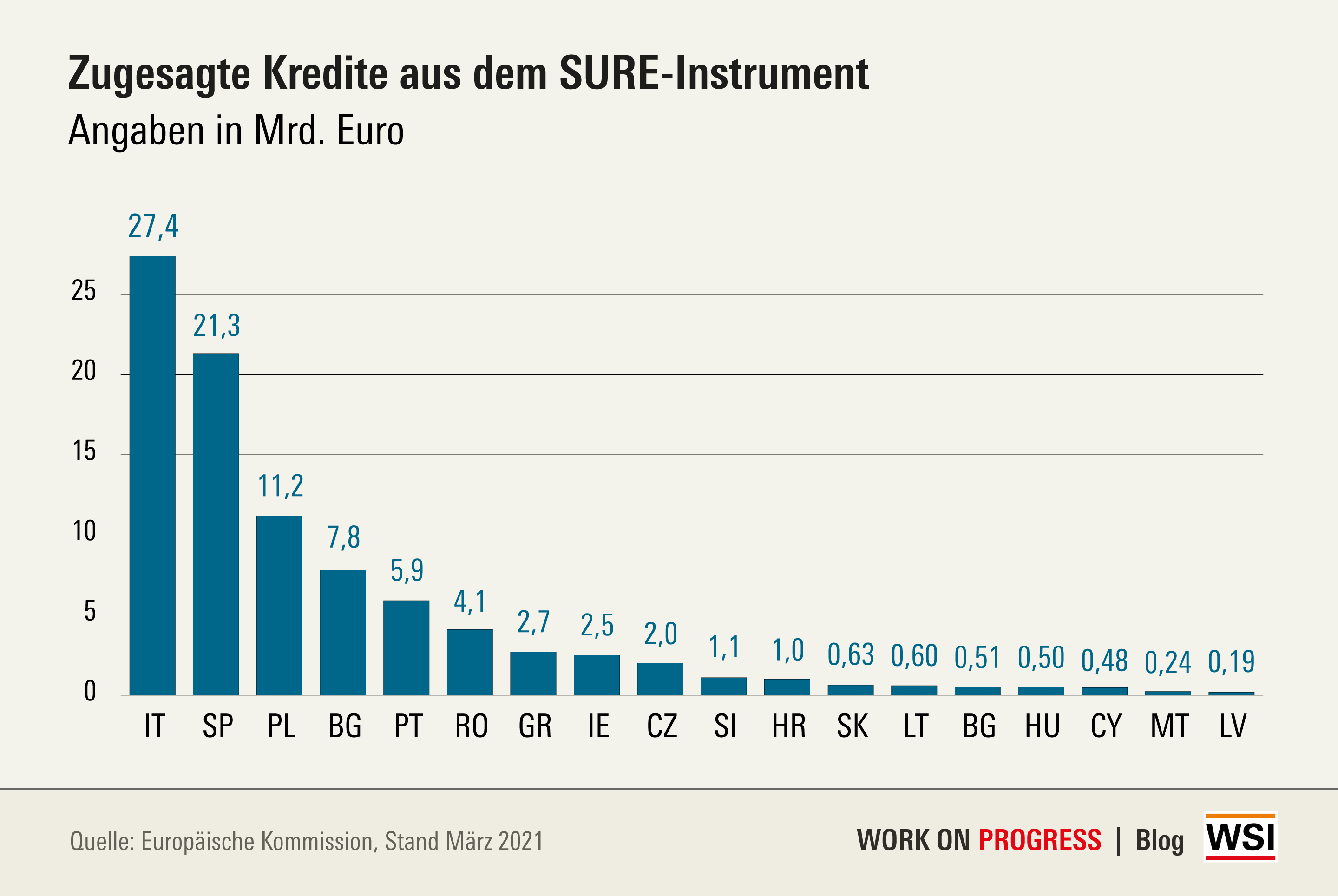 Ebenso enttäuschend ist es, dass die Kommission sich im Aktionsplan nicht zur Zukunft des SURE-Mechanismus äußert, den sie im Frühjahr 2020 initiiert hatte, um beschäftigungssichernde Maßnahmen in den Mitgliedstaaten durch gemeinsame europäische Anleihen zu unterstützen. So wird zwar eine Evaluierung des Instruments angekündigt, doch eine Positionierung zur Weiterführung oder Entfristung des Mechanismus sucht man im Aktionsplan vergeblich. 90 Prozent der von SURE zur Verfügung gestellten Mittel sind bereits an die Mitgliedstaaten verteilt worden (siehe Grafik) – dabei ist die Krise alles andere als überstanden. Europäische Unternehmen und Beschäftigte brauchen daher dringend Klarheit, ob sie auch in Zukunft auf die EU zählen können, wenn es darum geht, Kurzarbeit zu ermöglichen und damit Jobs zu retten.