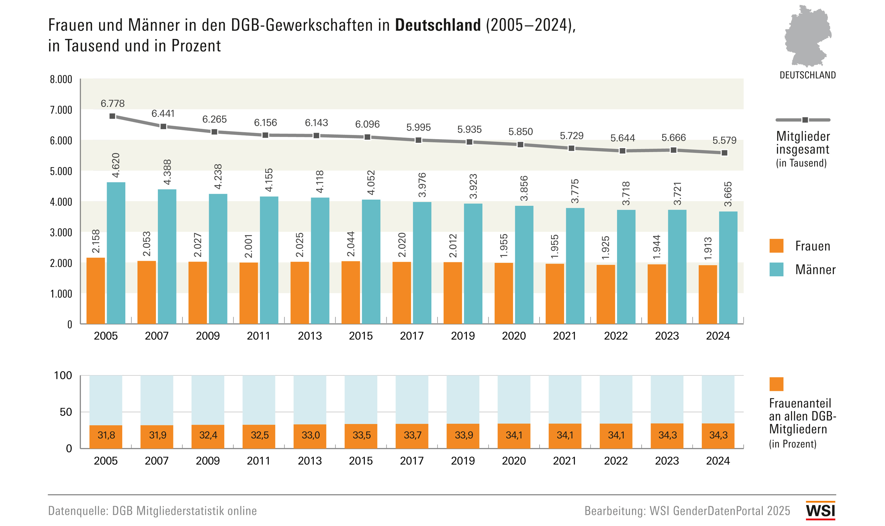 Der Frauenanteil in den DGB-Gewerkschaften ist innerhalb des Beobachtungszeitraums jedoch sogar von 32 Prozent (2005) auf 34 Prozent (2024) leicht angestiegen. Diese Entwicklung geht auf den stärkeren Rückgang bei männlichen Mitgliedern zurück: Die Mitgliederzahl der Frauen nahm zwischen 2005 und 2024 um 245 Tausend ab (Rückgang um 11 Prozent), die der Männer jedoch um 955 Tausend (Rückgang um 21 Prozent). Seit 2020 – und somit zum vierten Mal in Folge – liegt der Anteil der Frauen unverändert bei 34 Prozent.