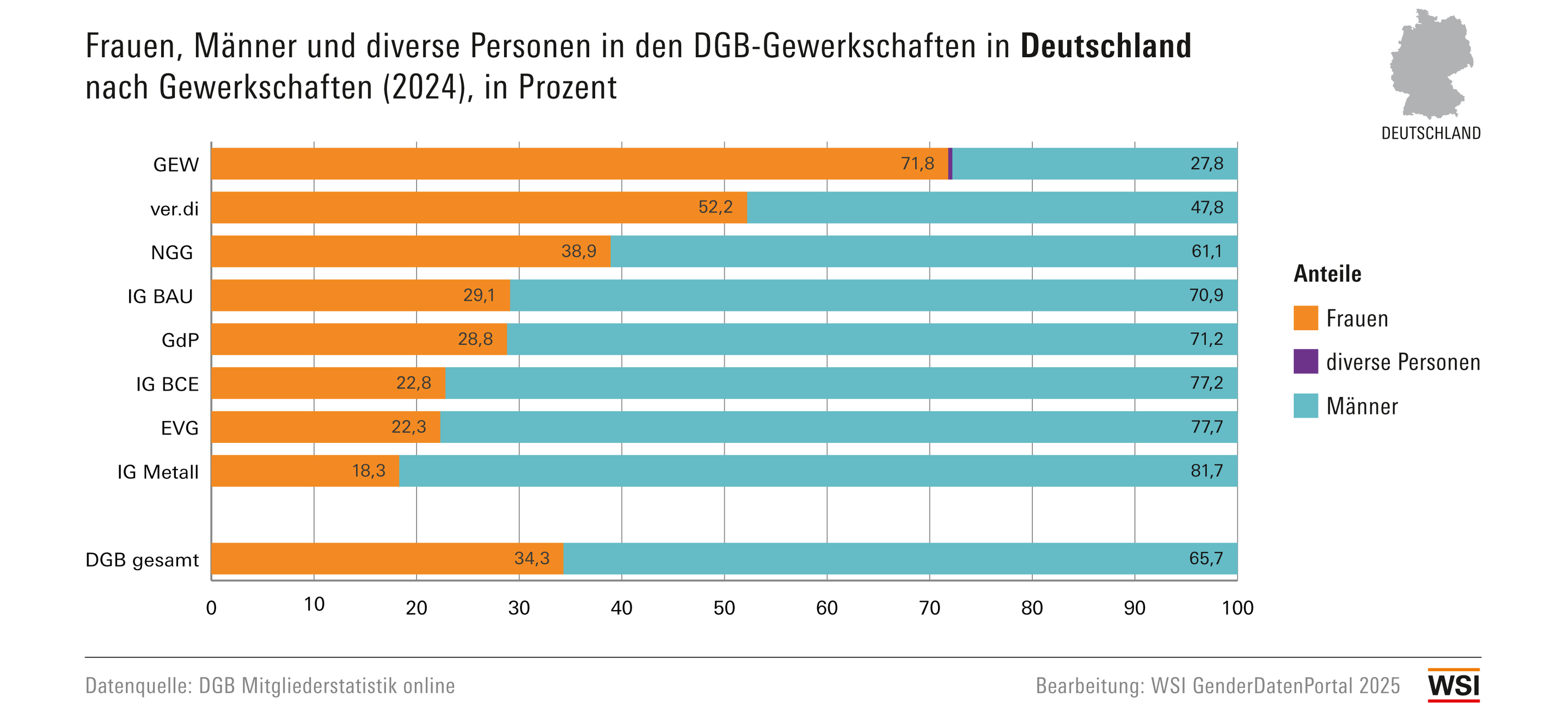 - Der mit Abstand höchste Frauenanteil findet sich in der GEW (Gewerkschaft Erziehung und Wissenschaft). Hier stellen Frauen im Jahr 2024 mit 72 Prozent die übergroße Mehrheit aller Mitglieder. Auch in ver.di (Vereinte Dienstleistungsgewerkschaft) sind mit knapp 52 Prozent mehr als die Hälfte aller Mitglieder Frauen. Mit 39 Prozent fällt auch der Frauenanteil in der NGG vergleichsweise hoch aus (Gewerkschaft Nahrung-Genuss-Gaststätten).