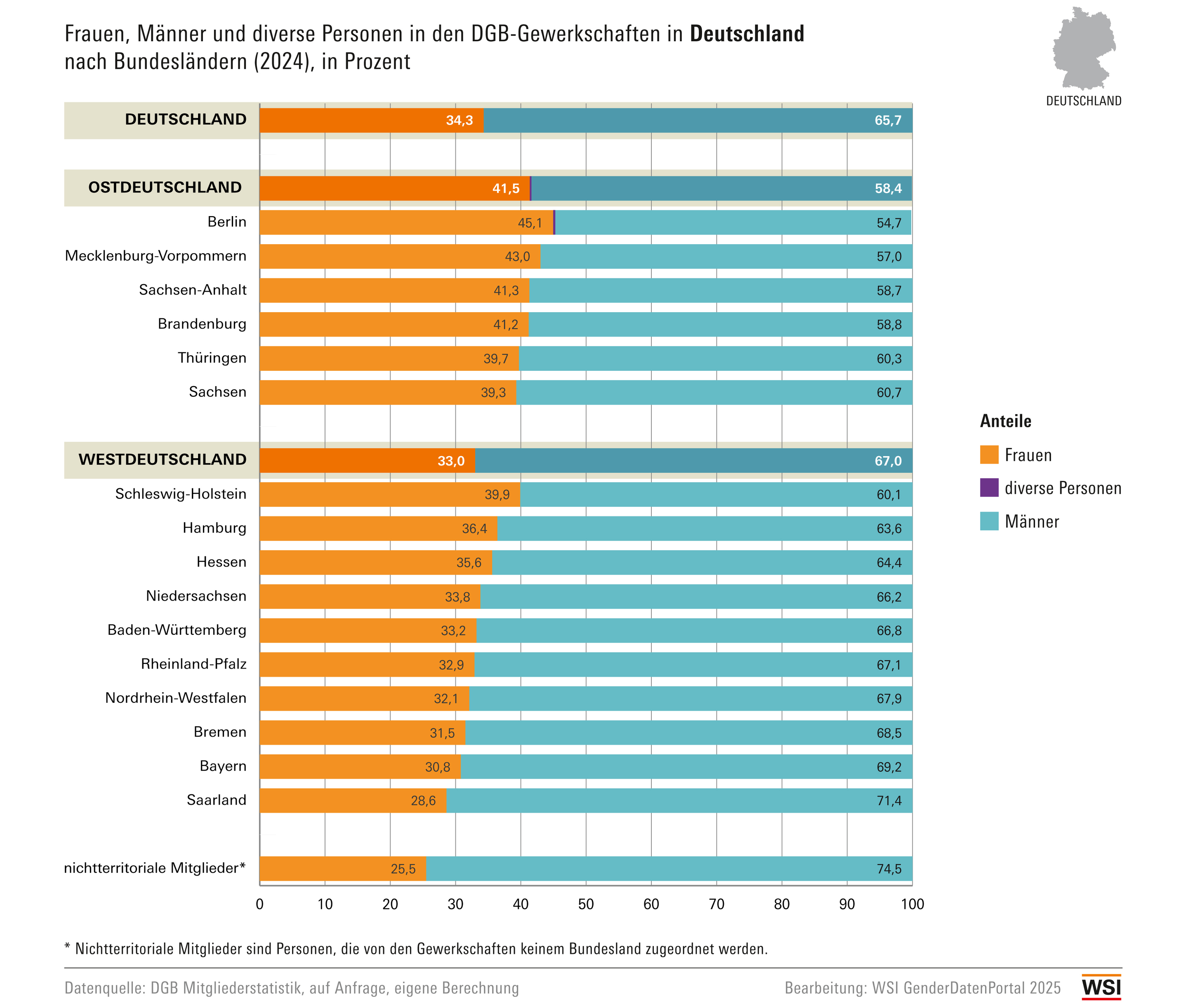 Auch im regionalen Vergleich zeigen sich Unterschiede hinsichtlich des Frauenanteils an den Gewerkschaftsmitgliedern (vgl. Grafik 3). Insgesamt stellen Frauen in Ostdeutschland mit 42 Prozent einen höheren Anteil an den Gewerkschaftsmitgliedern als Frauen in Westdeutschland (33 Prozent). Unterschiede zeigen sich auch zwischen den Bundesländern: In Ostdeutschland variieren die Frauenanteile an den DGB-Gewerkschaftsmitgliedern zwischen 45 Prozent (Berlin) und 39 Prozent (Sachsen). Für Berlin kann – anders als für andere Bundesländer – zudem bereits ein geringer Anteil von Mitgliedern mit diverser Geschlechtszugehörigkeit ausgewiesen werden (weniger als ein Prozent). (5) In Westdeutschland variieren die Frauenanteile sogar um bis zu 11 Prozentpunkte, zwischen Schleswig-Holstein mit dem höchsten Frauenanteil (40 Prozent) und dem Saarland mit dem niedrigsten Frauenanteil (29 Prozent). In fast der Hälfte der westdeutschen Bundesländer sind weniger als ein Drittel der DGB-Gewerkschaftsmitglieder Frauen.