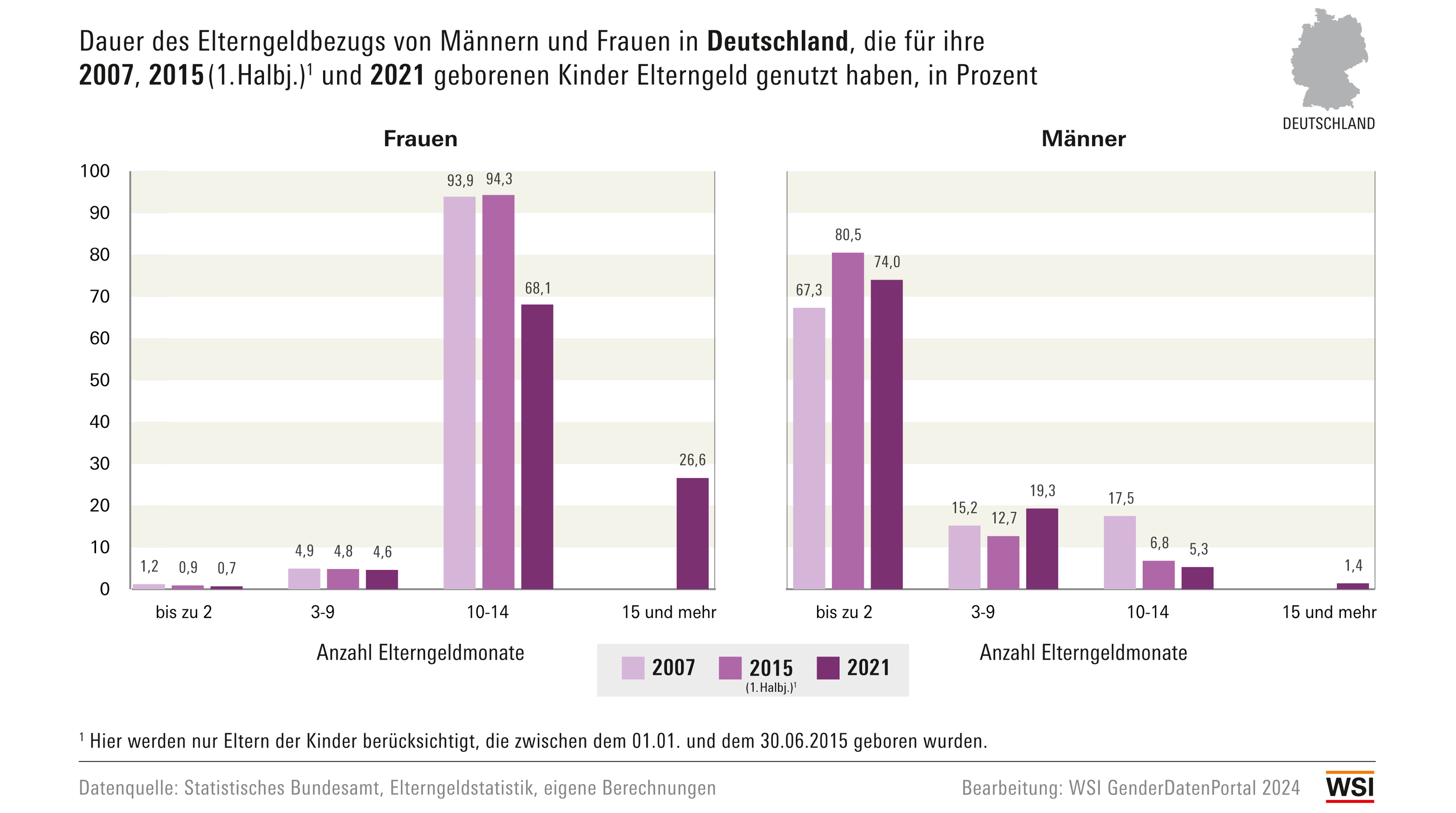 WSI GenderDatenPortal: Sorgearbeit: Dauer des Bezugs von Elterngeld/Elterngeldplus 2007-2021