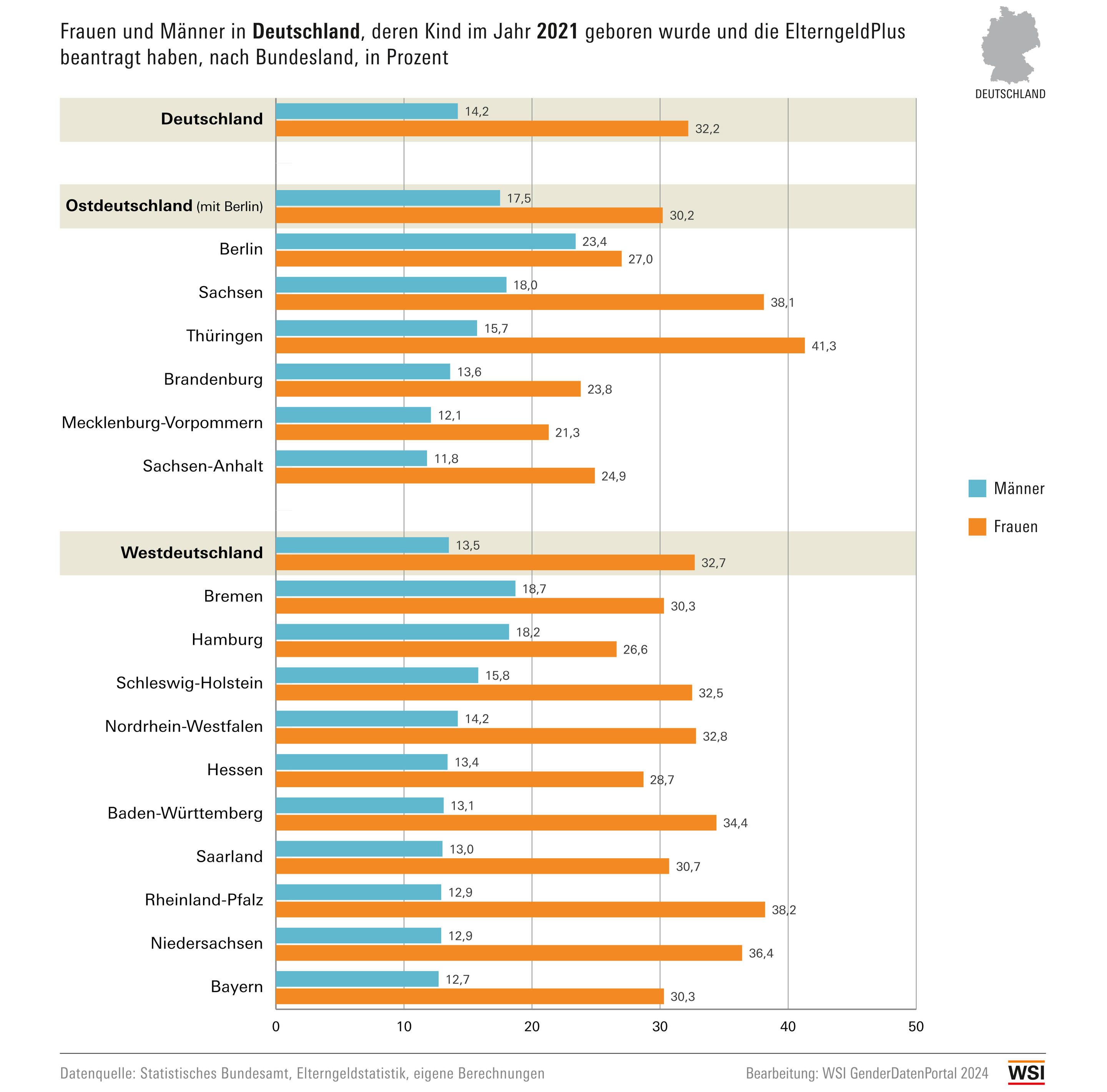 Der Vergleich zwischen West- und Ostdeutschland zeigt eine ungleiche Inanspruchnahme von ElterngeldPlus für im Jahr 2021 geborene Kinder in den einzelnen Bundesländern (vgl. Grafik 3). In Ostdeutschland nehmen Väter etwas häufiger ElterngeldPlus in Anspruch als in Westdeutschland (17,5 gegenüber 13,5 Prozent). Innerhalb Ostdeutschlands gilt, dass Väter sich in wirtschaftlich stärkeren Bundesländern häufiger am ElterngeldPlus beteiligen (Sachsen und Thüringen). In Westdeutschland besteht ein leichtes Nord-Süd-Gefälle: In überdurchschnittlichem Maße nutzen Väter das ElterngeldPlus in Bremen oder Hamburg, unterdurchschnittlich ist die Nutzung dagegen etwa im Saarland, in Rheinland-Pfalz oder in Bayern.