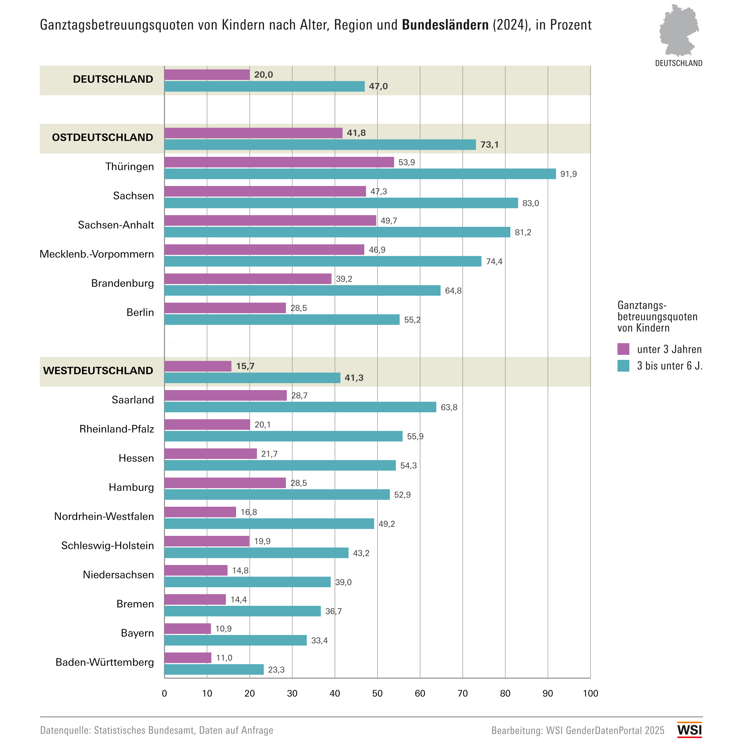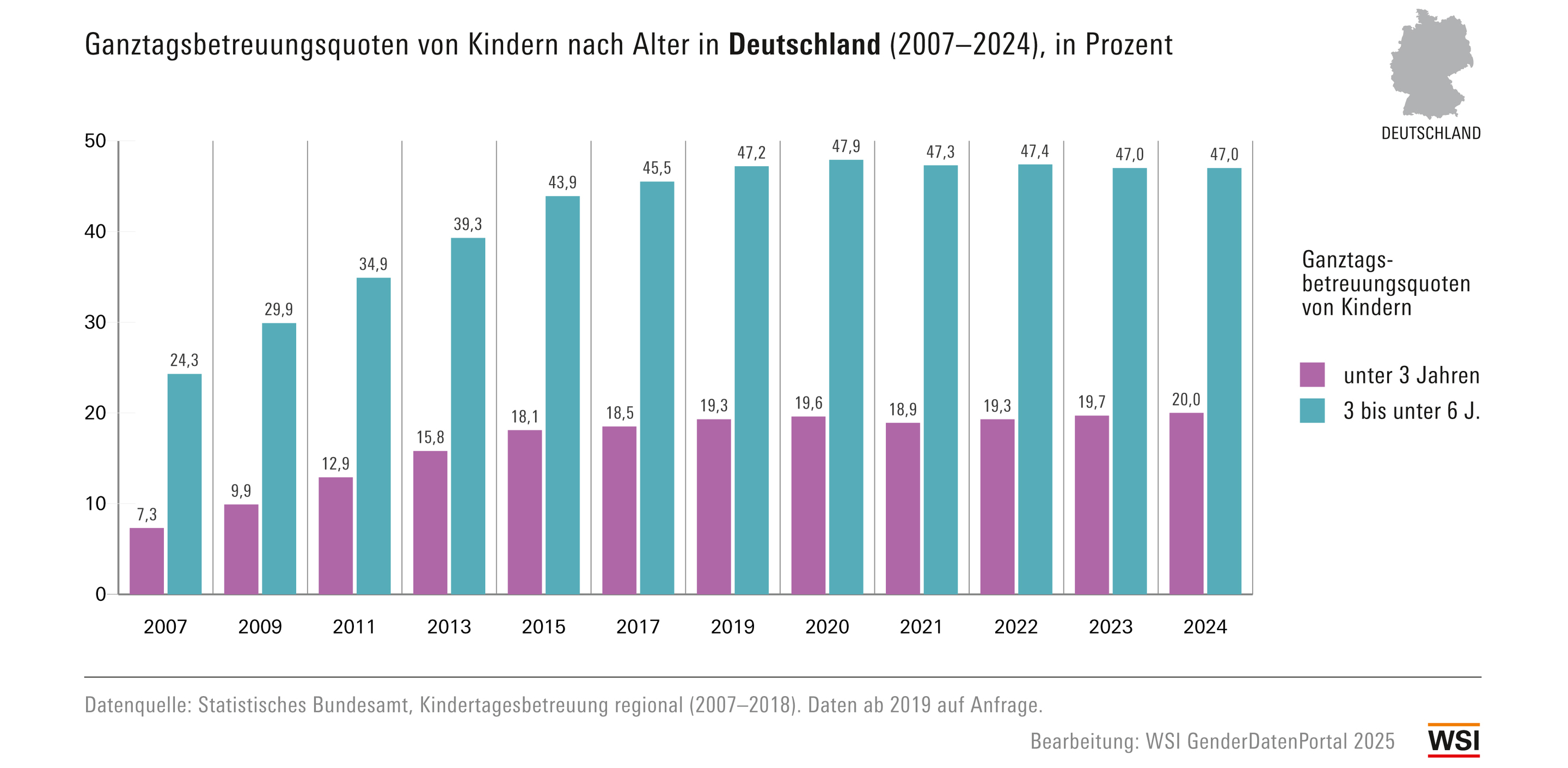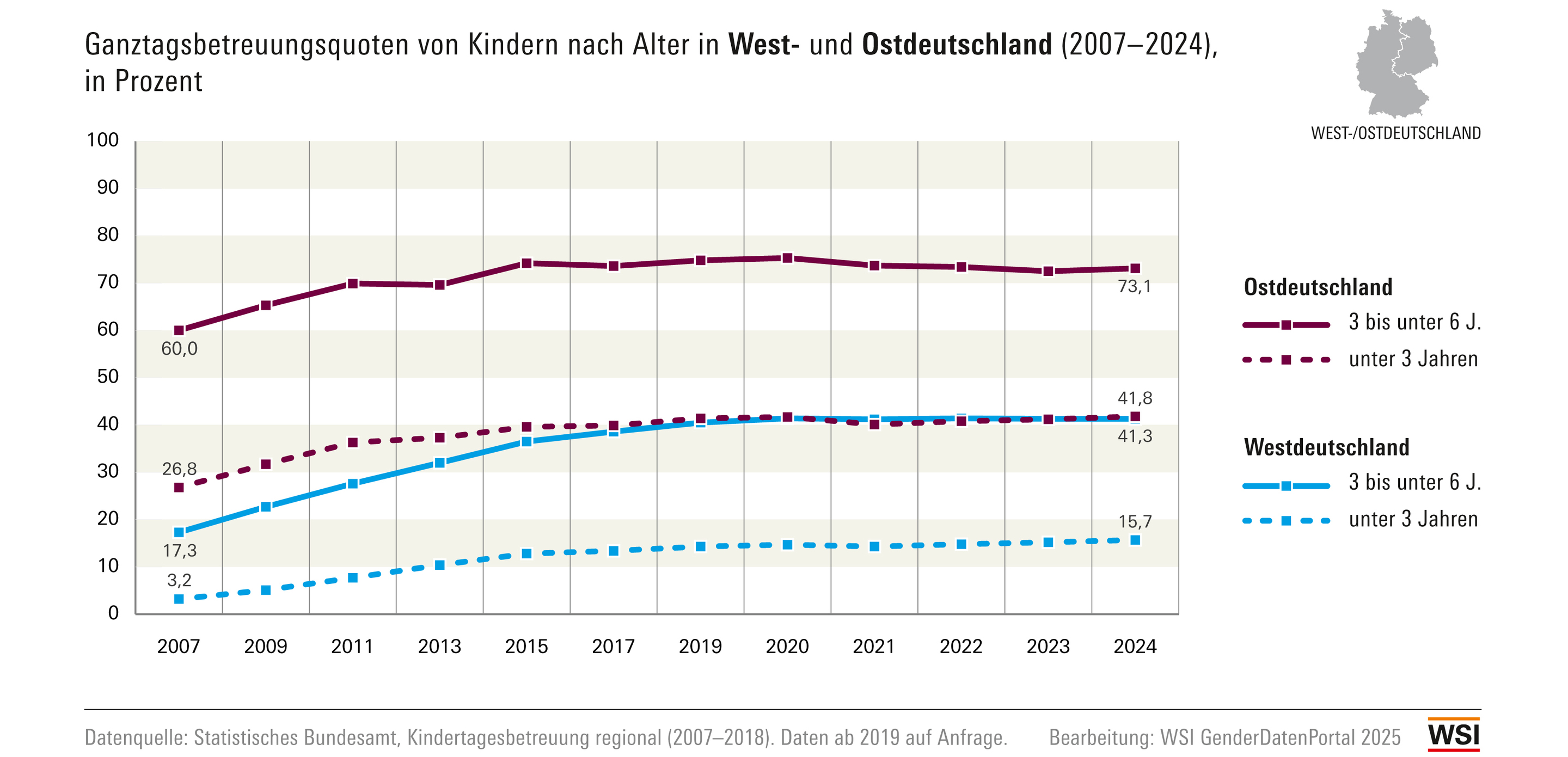 WSI GenderDatenPortal: Sorgearbeit: Ganztagsbetreuung von Kleinkindern nach Alter und Region 2007-2024