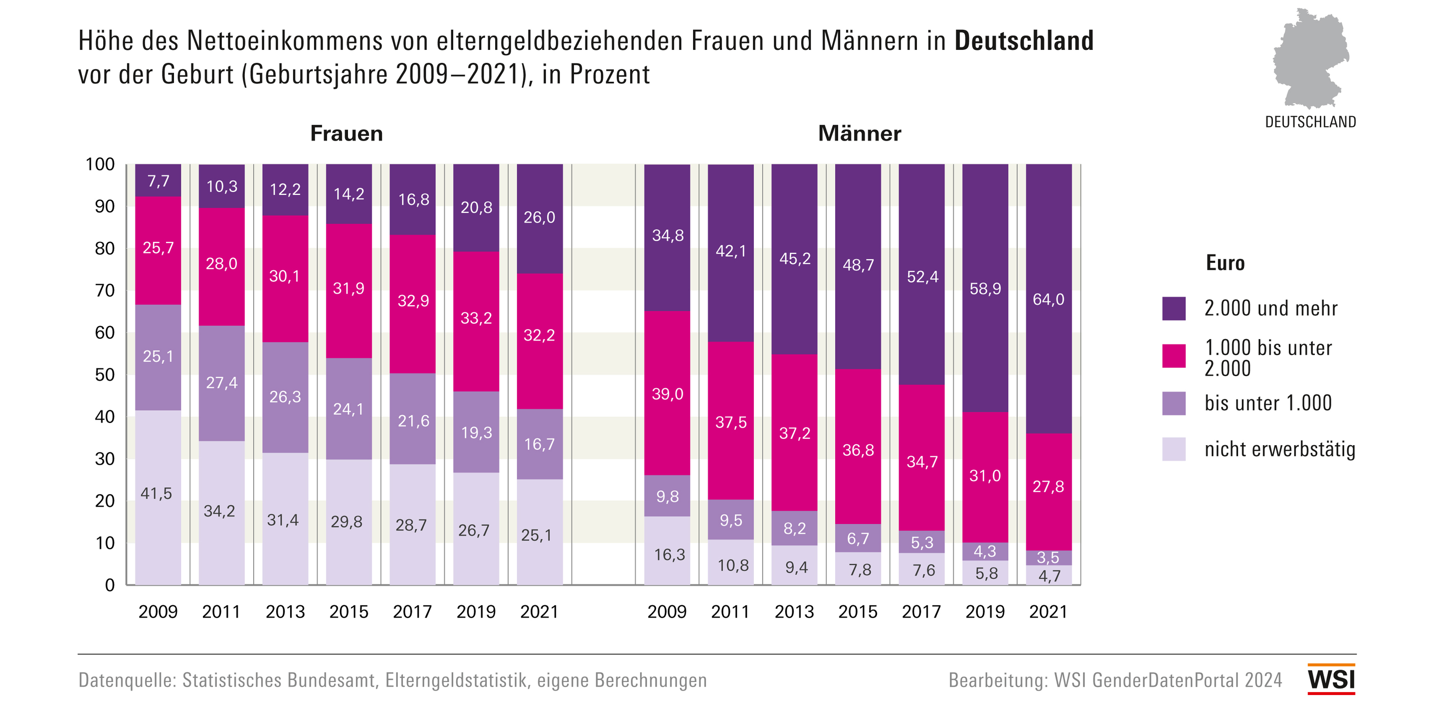 WSI GenderDatenPortal: Sorgearbeit: Höhe des Elterngeldes nach Geburtsjahr des Kindes 2008-2021