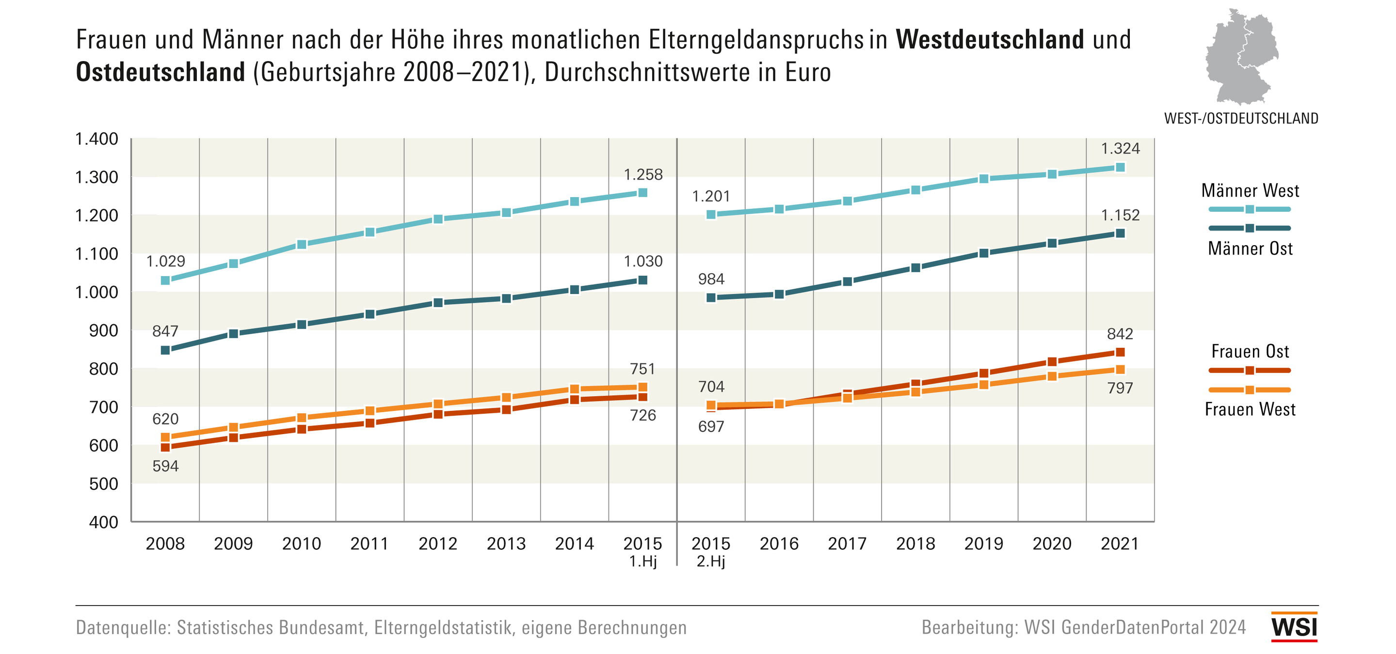 (5) Ab dem 2. Halbjahr 2015 ergeben sich die Durchschnittswerte aus Basiselterngeld- und den (geringer ausfallenden) ElterngeldPlus-Ansprüchen. Ein weiterer Grund für den höheren bzw. stärker ansteigenden Elterngeldbezug von Müttern in Ostdeutschland seit 2015 ist daher auch der tendenziell geringere Anteil an ElterngeldPlus-Nutzerinnen in ostdeutschen Bundesländern. Vgl. dazu Pfahl, Svenja/Unrau, Eugen (2024): Dauer des Bezugs von Elterngeld/ElterngeldPlus 2007 – 2021, in: WSI GenderDatenPortal.