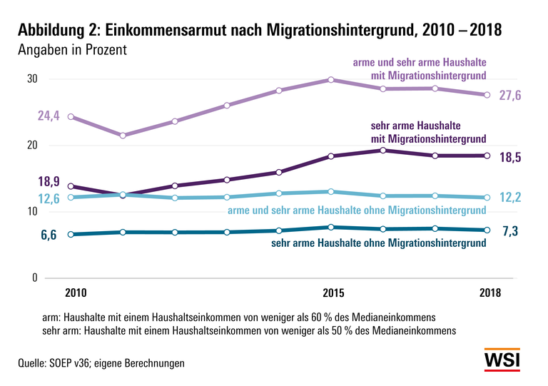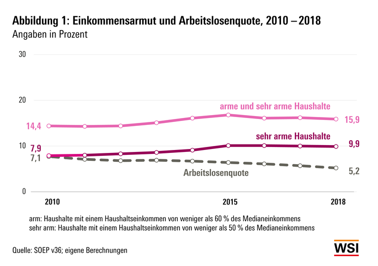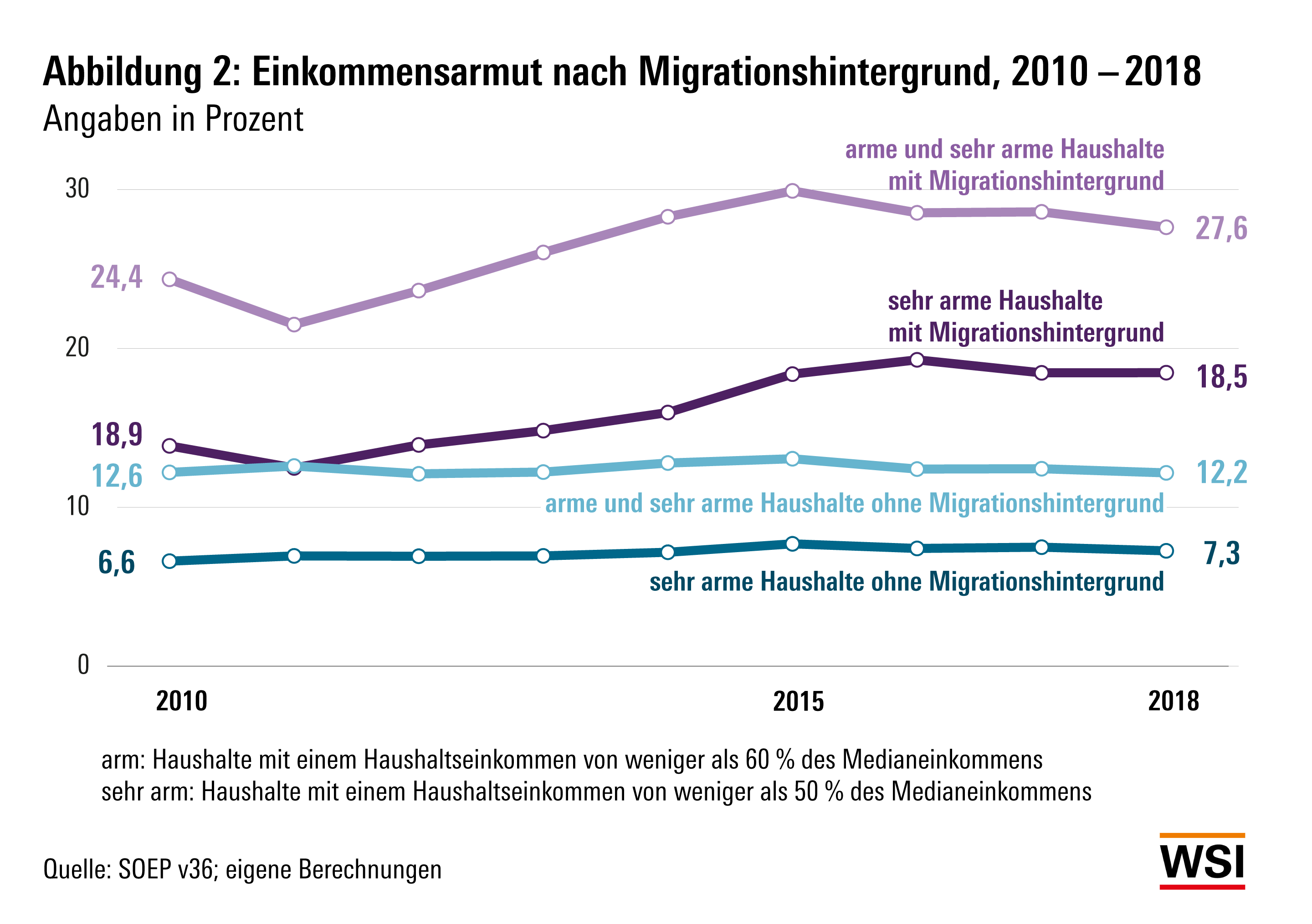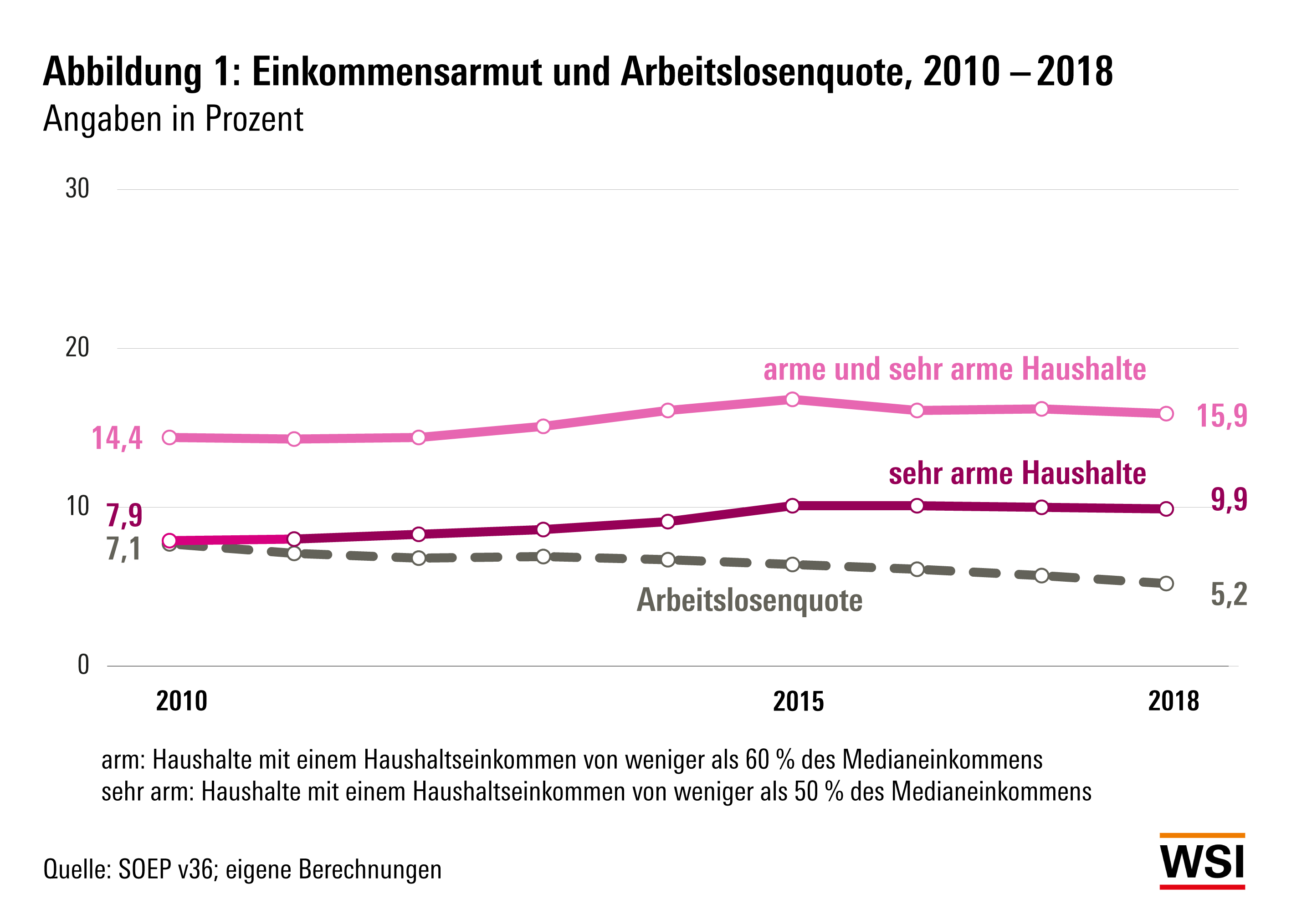 Als einkommensarm gelten in Deutschland alle Haushalte mit einem Haushaltseinkommen von weniger als 60 % des Medianeinkommens. Als sehr arm gelten diejenigen mit einem Haushaltseinkommen unter 50 % des Medianeinkommens. Seit 2010 ist der Anteil der armen Haushalte von 14 % auf 16 % gestiegen, der der sehr armen von 8 % auf 10 %.