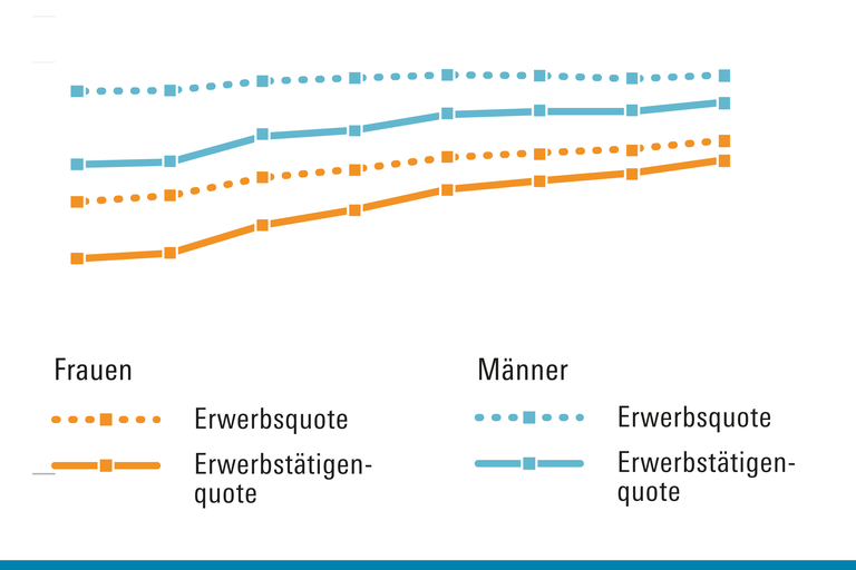 Frauen sind in Deutschland immer noch seltener erwerbstätig als Männer, allerdings hat sich die Teilhabe am Erwerbsleben beider Geschlechter zwischen stark angeglichen.