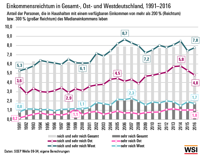 Der Anteil der sehr Reichen, also der Haushalte, die ein Einkommen erzielen, das über dem Dreifachen des Medianeinkommens liegt, schwankt in Westdeutschland um die Zwei-Prozent-Marke. In Ostdeutschland liegt dieser Wert wiederum etwa bei der Hälfte des westdeutschen Wertes und bewegt sich um die Ein-Prozent-Marke.