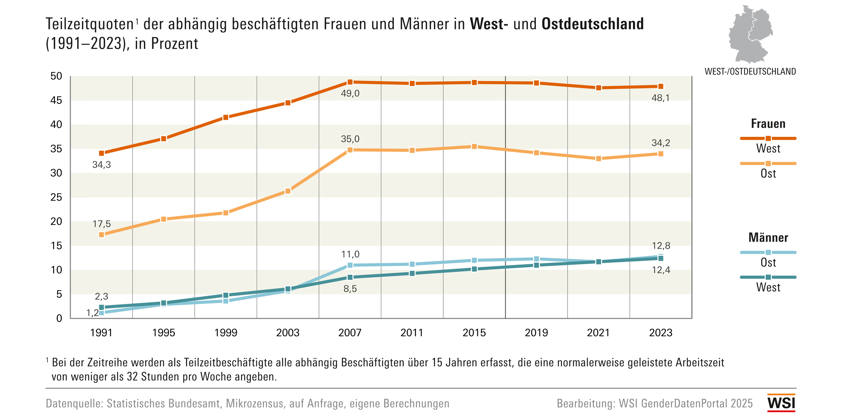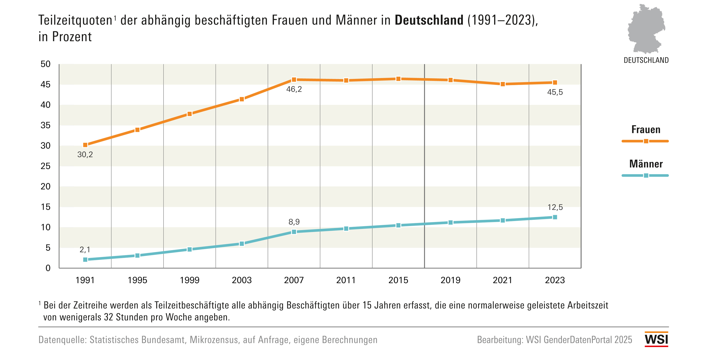 WSI GenderDatenPortal: Zeit: Teilzeitquoten der abhängig Beschäftigten 1991–2023