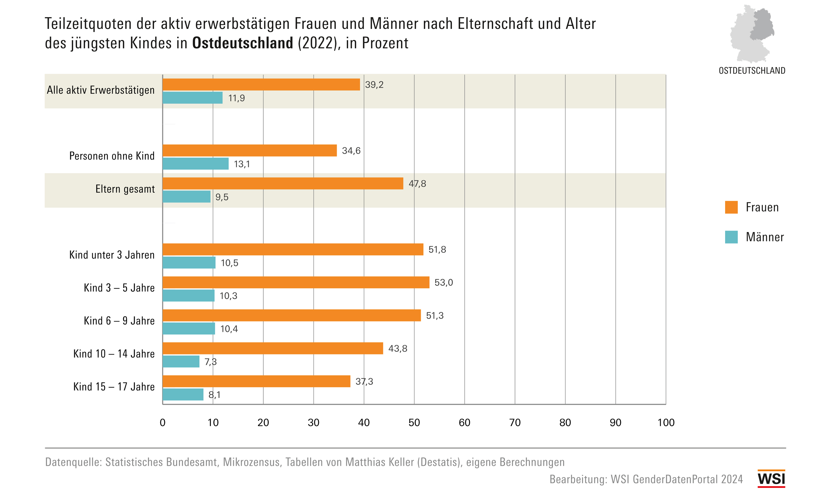 - In Ostdeutschland ist nur jede zweite aktiv erwerbstätige Mutter teilzeitbeschäftigt (48 Prozent), genauso wie jede dritte Frau ohne (minderjährige) Kinder (35 Prozent). Elternschaft wirkt sich damit für Frauen in Westdeutschland stärker auf den Arbeitszeitumfang aus als in Ostdeutschland. (1) (2)